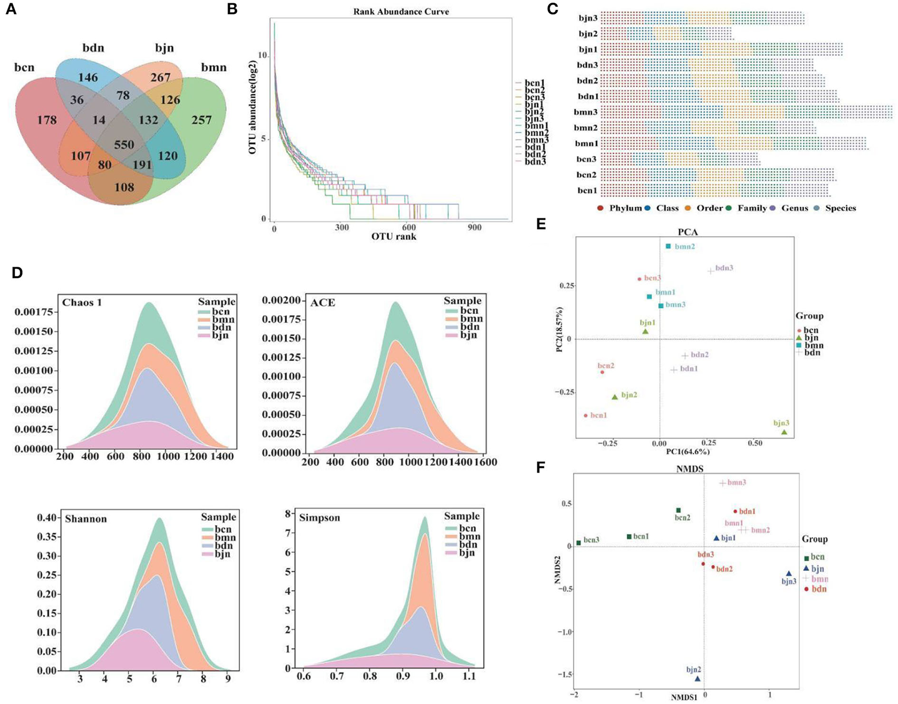 OTU number and diversity of intestinal contents microbiota. (A) Venn diagram. (B) Rank abundance distribution curve. The longer the folded line, the greater the number of OTUs in the sample. The gentler the curve, the better the uniformity of the community; the steeper the curve, the lower the homogeneity of the community. (D) OTU number of each sample at different classification levels. (C) OTU in each sample at each classification level. (D) Chaos 1 index; ACE index; Shannon index; Simpson index. (E) PCA analysis. (F) NMDS analysis. Data were mean ± SD, n = 3, p > 0.05. bcn: normal saline-treated basal diet group; bmn: normal saline-treated high-fat diet group; bdn: DO traditional decoction-treated high-fat diet group; bjn: lipid-lowering decoction-treated high-fat diet group.