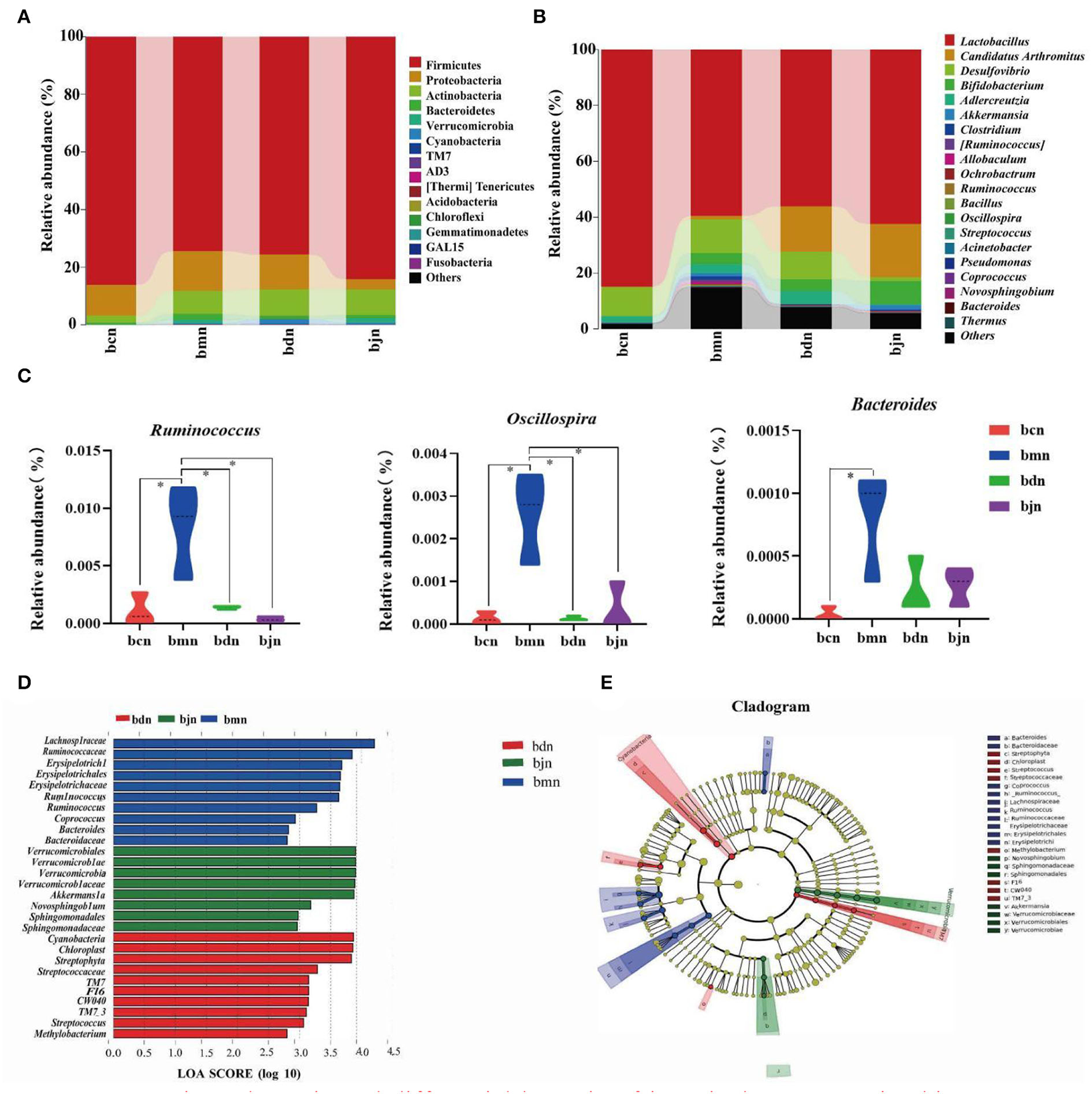 We screened the top 20 phyla and genera in terms of relative abundance and presented them in bar charts (Figures 5A,B). Then, statistical analysis of the above species revealed (Figure 5C) that, compared to the bcn group, the bmn group had a notably higher abundance of Ruminococcus, Oscillospira, and Bacteroides (p < 0.05; p < 0.05; p < 0.05). The bdn group had a substantial reduction of Ruminococcus and Oscillospira compared with the bmn group (p < 0.05; p < 0.05). Therefore, DO intervention inhibited the growth of dominant bacteria including Ruminococcus and Oscillospira. LEfSe analysis results presented that 10, 10, and 8 dominant taxa in the bmn, bdn, and bjn groups, respectively (Figure 5D). Among them, the bmn group was markedly enhanced in genera Bacteroides, Ruminococcus, and Coprococcus. The bdn group was rich in genera Streptococcaceae, Methylobacterium, and Streptococcus. The bjn group was characterized by a greater increase in the abundance of genera Akkermansia, Sphingomonadaceae, Novosphingobium, and Verrucomicrobiaceae. In the different classification systems (Figure 5E), there were significant differences in the differential bacteria among the three groups.