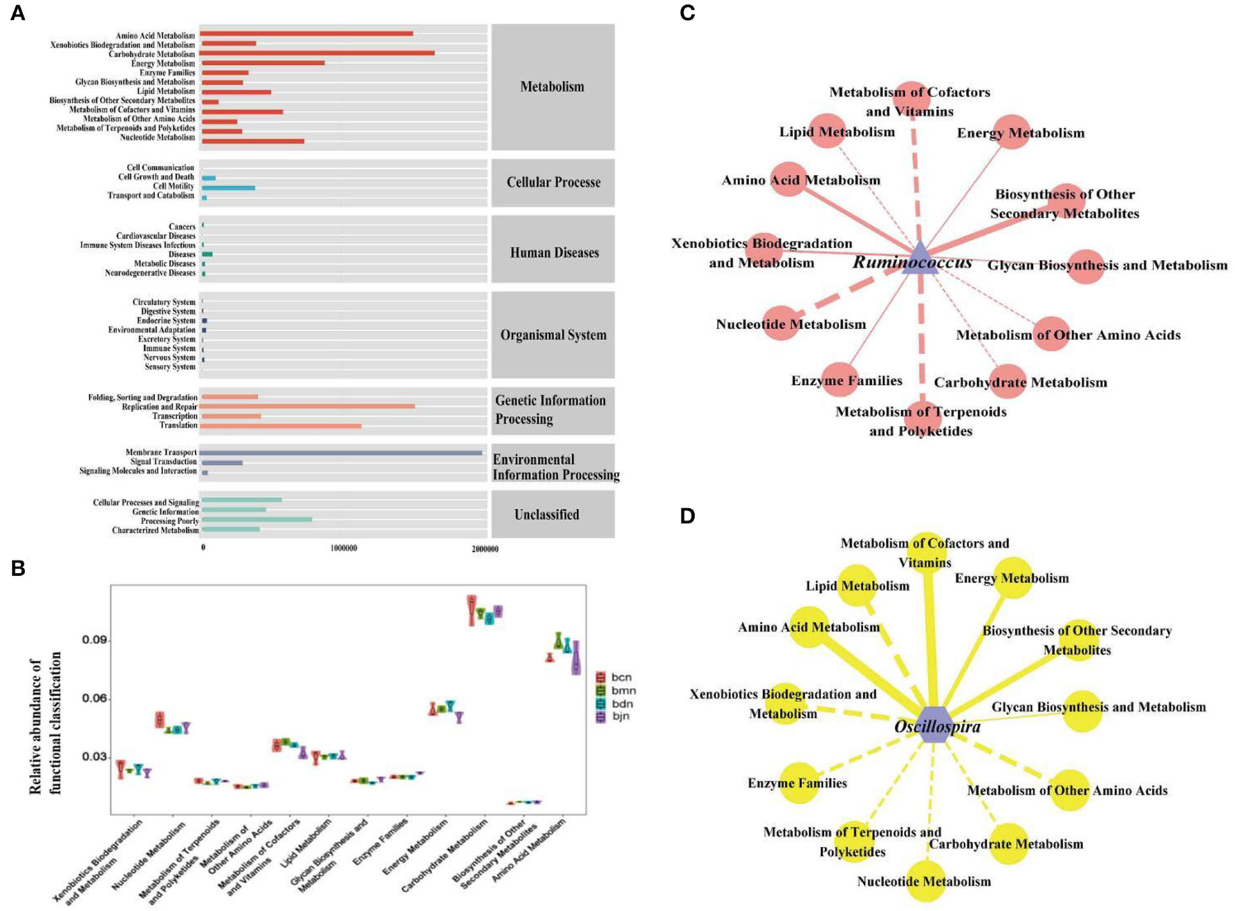Functional analysis of intestinal contents microbiota. (A) Predicted abundance of KEGG function. (B) Histogram of metabolic function. (C) Interaction network of “Ruminococcus-metabolic function”. (D) Interaction network of “Oscillospira-metabolic function.” Solid line represented positive correlation, dotted line represented negative correlation. The thickness of the line indicated the strength of the correlation. bcn: normal saline-treated basal diet group; bmn: normal saline-treated high-fat diet group; bdn: DO traditional decoction-treated high-fat diet group; bjn: lipid-lowering decoction-treated high-fat diet group.