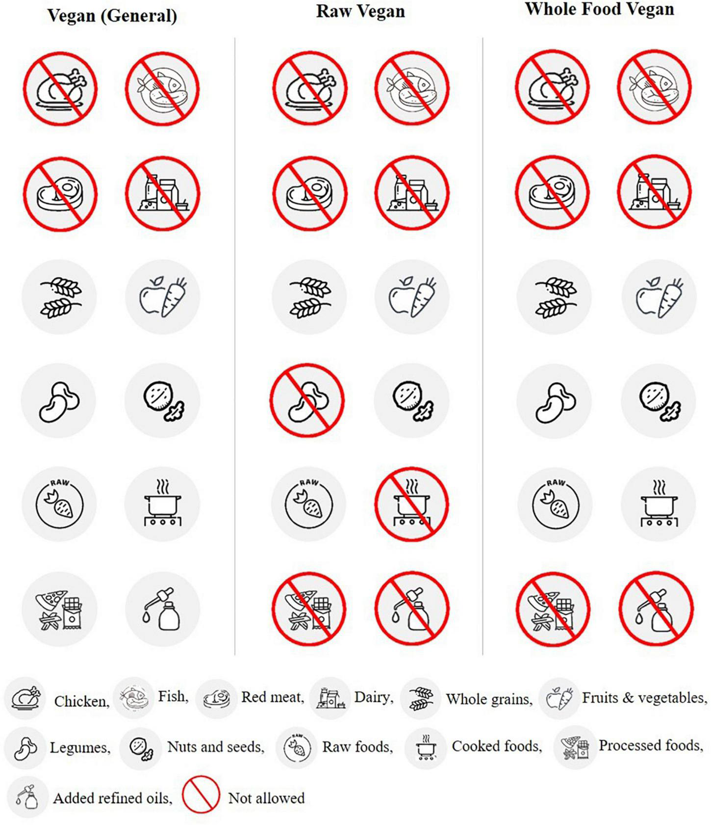 The VD is a dietary pattern characterized by no consumption of meat and meat products, seafood, poultry, and sometimes other animal products like eggs, animal milk, and honey. Some studies have linked meat intake with an increased risk of chronic diseases, while others indicate a positive association between low meat intake and life expectancy (82, 83). VD are of four main types: (i) a lacto-ovo-vegetarian does not consume any meat product but consumes eggs and dairy products (ii) a lactovegetarian does take dairy products but does not consume eggs and meat products (iii) an ovo-vegetarian does not eat meat products and dairy products and are free to consume eggs (iv) a vegan does not consume any animal products, including meat, eggs, dairy products, and honey (84). Vegan diets include different subtypes: raw vegan, vegan (general), and whole-food vegan (Figure 2). Each subtype has its own set of foods allowed and restricted with one thing in common, i.e., meat products restriction. This dietary pattern is gaining much popularity in the general population, especially in the Western world (85). There are various reasons for adopting this dietary profile, including religious beliefs, ethical motivation, cultural aspects, and health considerations (85, 86).