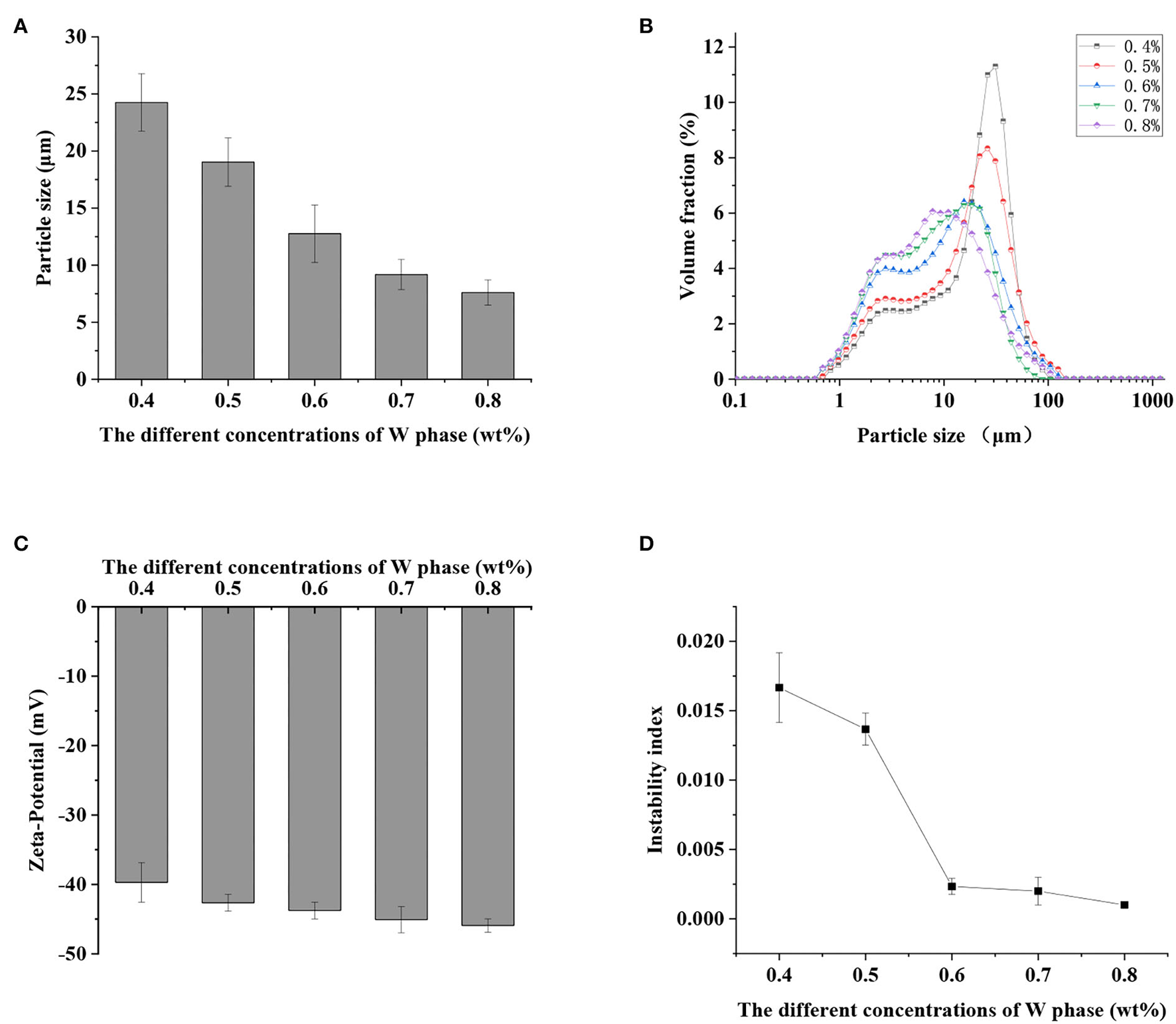Effect of the different concentrations of propylene glycol alginate and Xanthan gum (PGA-XG) complexes (0.4, 0.5, 0.6, 0.7, and 0.8 wt%) on the particle size (A), particle size distribution (B), zeta potential (C), and instability index (D) of S/O/W calcium-lipid emulsions.