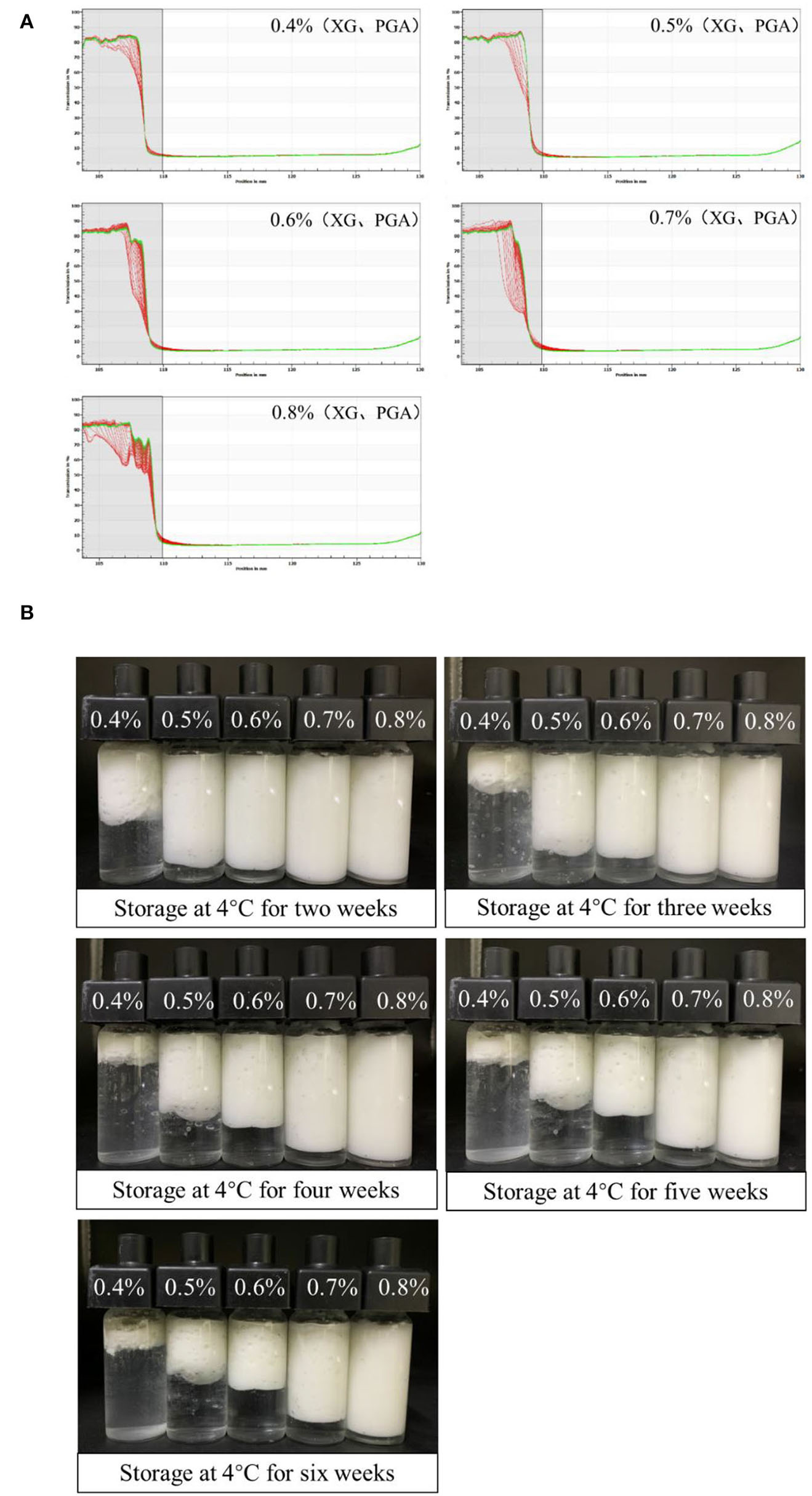 Physical stability tested by LUMiSizer [(A), original transmission] of PGA-XG complexes stabilized S/O/W calcium-lipid emulsions as a function of concentrations. All the first profiles lie at the bottom, the last profiles lie at the top. Visual images (B) of the creaming stability of Solid-in-Oil-in-Water (S/O/W) calcium-lipid emulsions stabilized by different concentrations of PGA-XG complexes (0.4, 0.5, 0.6, 0.7, and 0.8 wt%) during 42 days of storage at 4°C.