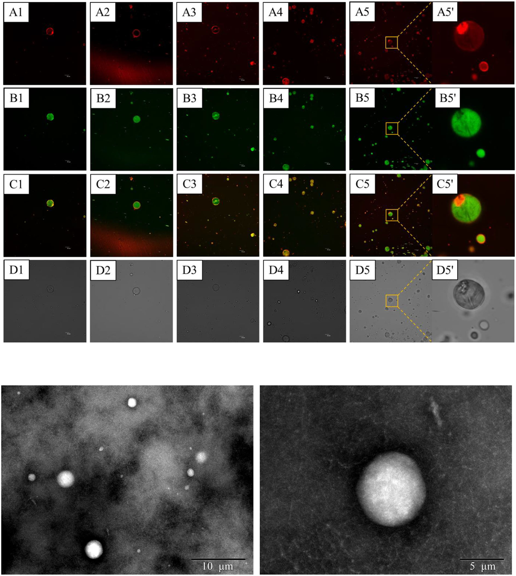 Confocal laser scanning microscope (CLSM) images (A) of S/O/W calcium-lipid emulsions stabilized by different concentrations of PGA-XG complexes. The calcium carbonate (CaCO3) dyed by Rhodamine B (RB) (excitation at 543 nm) showed red fluorescence (A), whereas the oil droplet dyed by Nile Red (excitation at 488 nm) showed green fluorescence (B). Combined image (C). Bright field (D). The scale bar is 10 μm (1–5: 0.4, 0.5, 0.6, 0.7, and 0.8 wt%, respectively; 5': high magnified image at 0.8 wt%). Transmission electron microscopy (TEM) images (B) of S/O/W calcium-lipid emulsions stabilized by 0.8 wt% concentration of PGA-XG complexes.