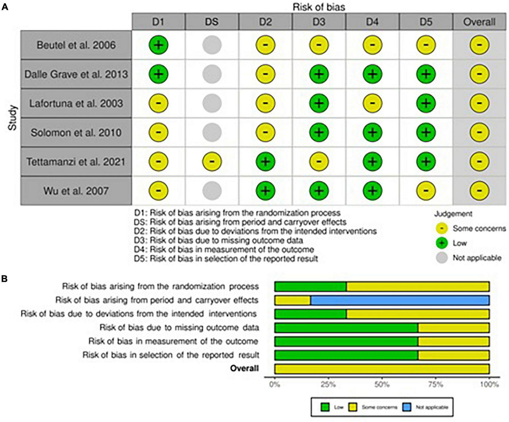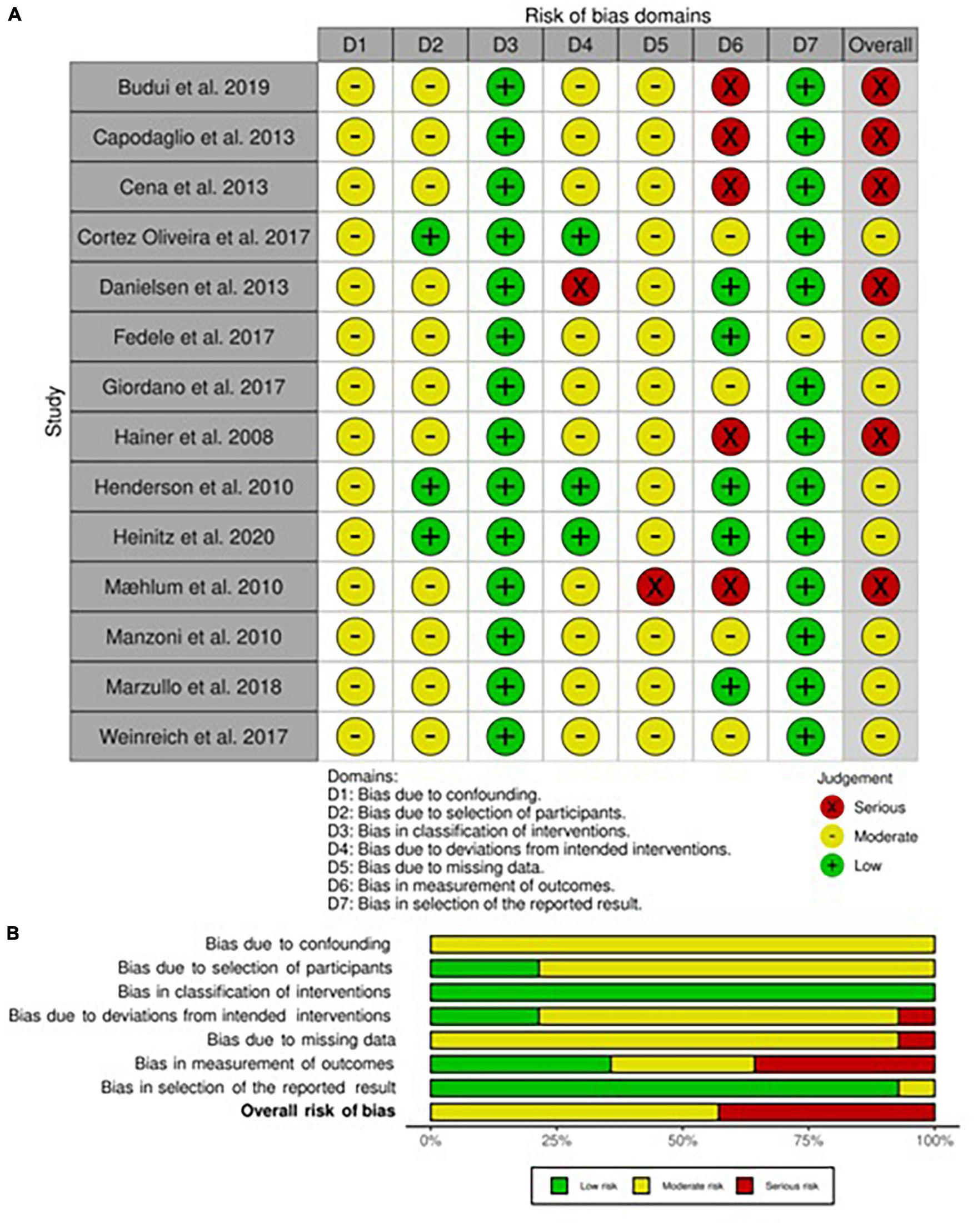 All studies showed at least one concern among the categories of bias analyzed (Figures 4A,B, 5). Some concerns for allocation were individuated in four articles due to a lack of description of randomization design (25, 33, 35, 43). As previously described, studies that included a physical activity protocol that did not specify intensity level or diet without a precise indication of calories were judged at medium risk of deviation bias (25, 32, 35, 40). Missing data were also having some concerns in two studies since the attrition analysis couldn’t still completely ensure the inexistence of bias due to a high dropout percentage (33, 40). The risk of bias for the measurement of outcomes was mainly lower compared to non-randomized studies even if some concerns were individuated in studies that included non-completely objective measurements (25, 40). The selection of the reported result brought concerns only in one study due to some possible interactions between study groups (40). As regards the only cross-over study, the lack of awash-out period led to a medium level of concern for the risk of bias even if no evidence exists in terms of possible contamination of results (33).