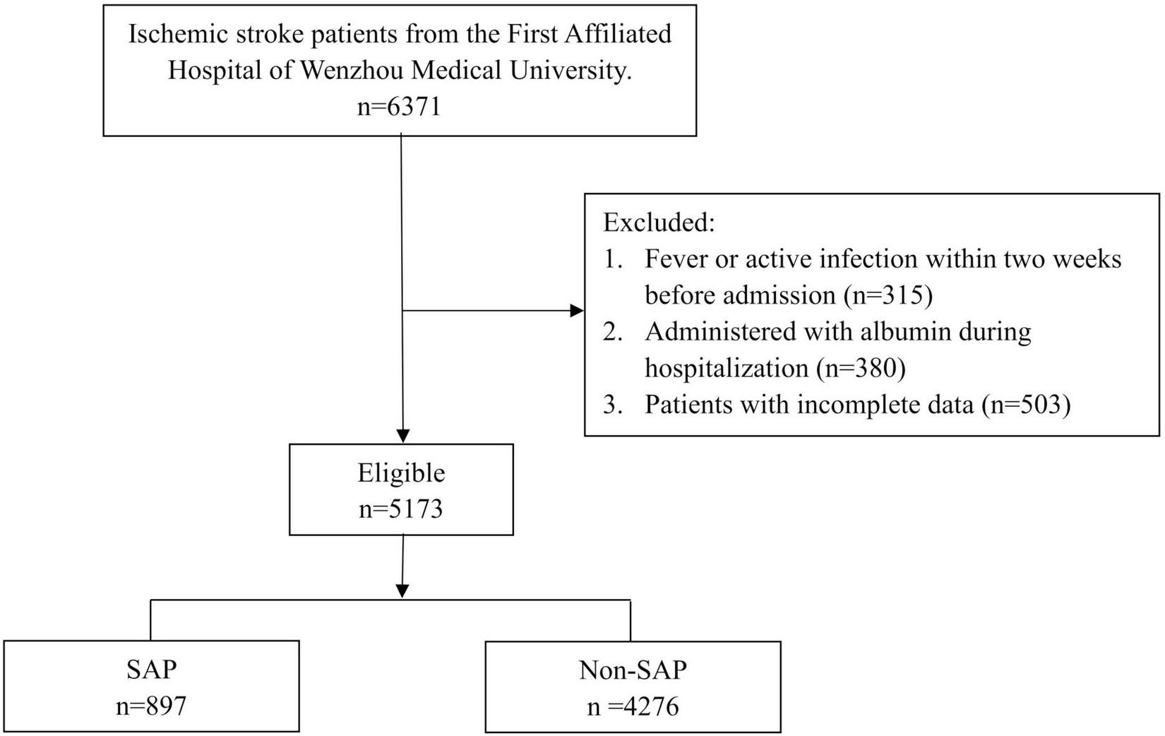 The exclusion criteria were as follows: (1) fever or active infection within 2 weeks before admission; (2) administered with albumin during hospitalization; (3) patients with incomplete data. Following the inclusion and exclusion criteria, we finally included 5,173 AIS patients, segmented into SAP (n = 897) and non-SAP (n = 4,276) groups.