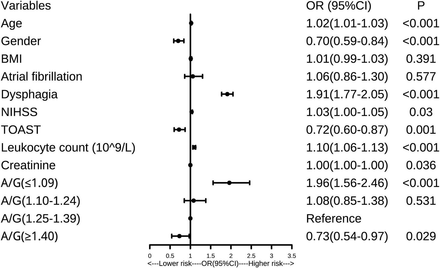 Forest plot of the association between albumin to globulin ratio (A/G) and stroke-associated pneumonia (SAP). A/G, albumin to globulin ratio; SAP, stroke-associated pneumonia; BMI, body mass index; NIHSS, National Institutes of Health Stroke Scale; TOAST, the trial of ORG 10172 in acute stroke treatment; OR, odds ratio.