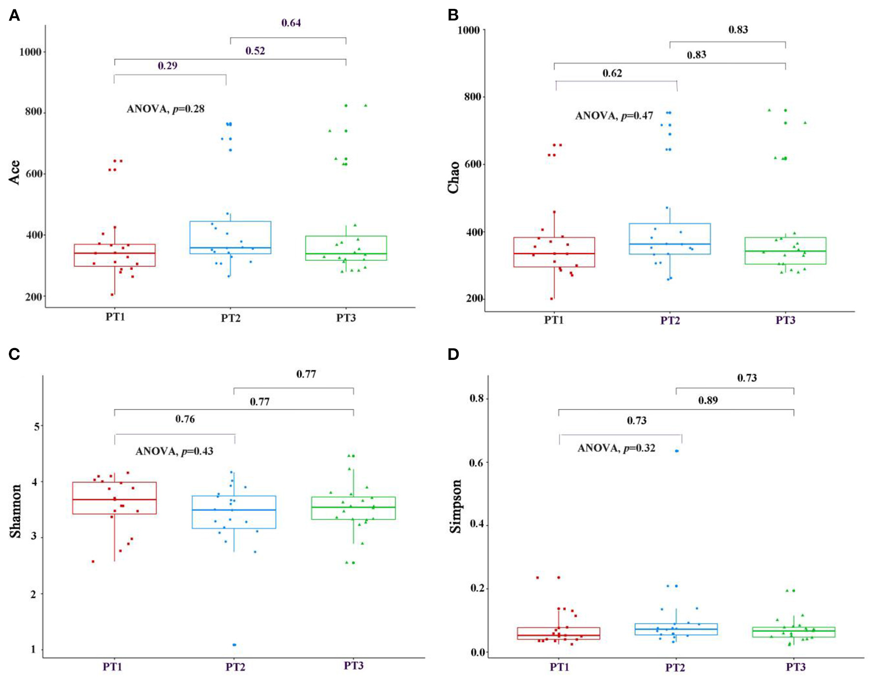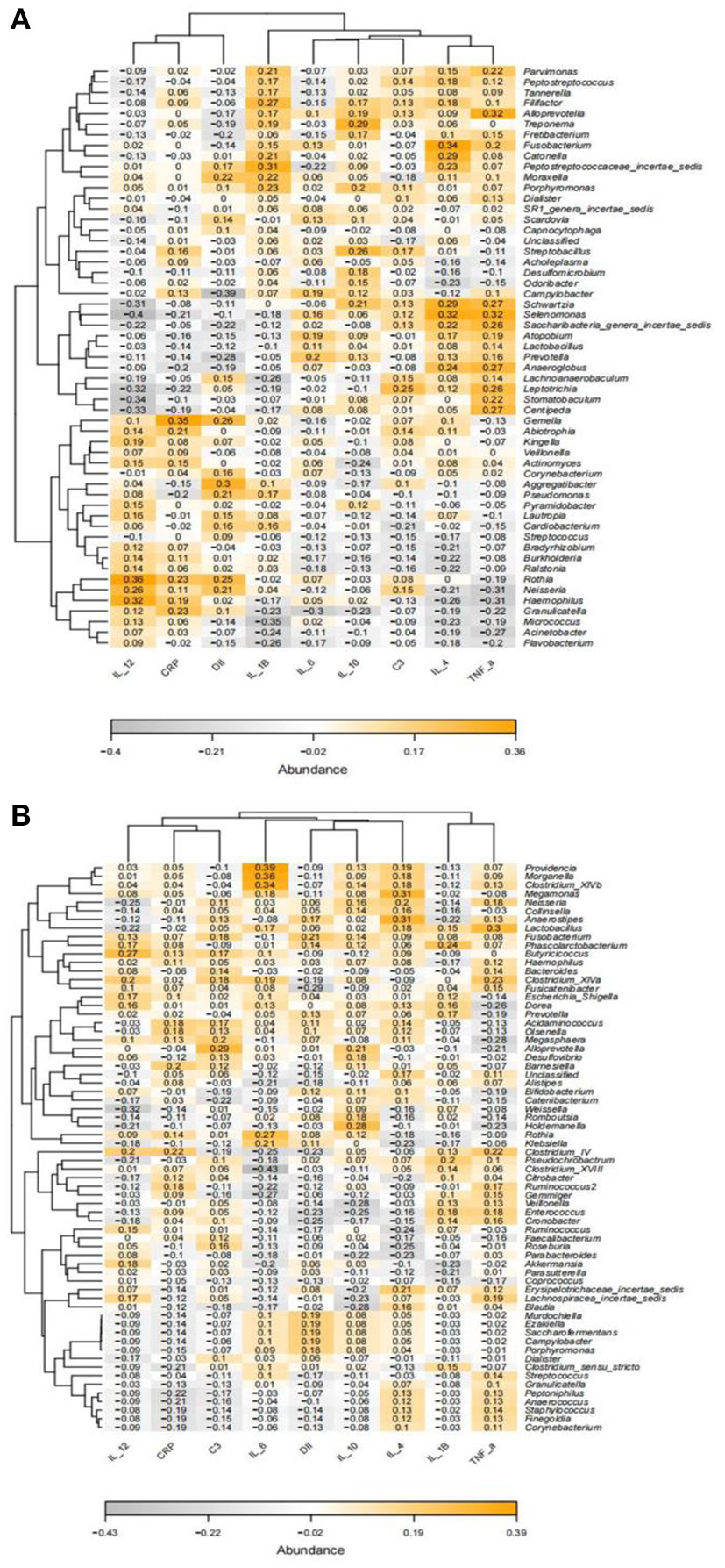Blood samples were collected from the participants after an overnight fast by trained laboratory staff. Immediately after the sample of venous blood was collected, it was centrifuged and stored at −80°C before processing. The serum concentrations of IL-6, complement 3 (C3), high-sensitivity (hs-CRP), IL-1β, IL-4, IL-10, IL-12, as well as TNF-α, were determined with an enzyme-linked immunosorbent assay method according to the manufacturer's directions (Elabscience, Wuhan, China). Oral and blood samples were collected on the same day, except for fecal sample.