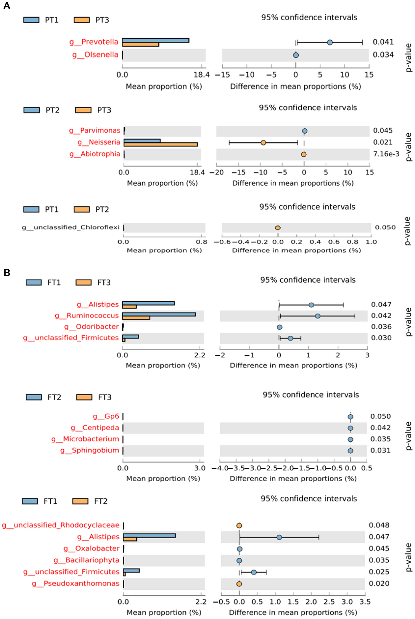 The α- (Shannon, Simpson, Chao1, and ACE index) and β-diversity analyses (Bray–Curtis dissimilarity and principal coordinate analysis [PCoA]) were conducted using QIIME and R software to compare the similarity among samples in terms of the diversity of species. Analysis of variance (ANOVA) or the Kruskal–Wallis test was performed to evaluate α-diversity among the different groups. Permutational multivariate analysis of variance (PERMANOVA) was employed to identify the different microbial communities among groups. The relative abundance diagram of flora species was mainly used to visualize the results of species annotation. STAMP analysis was used to identify species that differed in abundance between two or more groups. The key taxa responsible for the differences in the oral and gut microbiota between AD groups were identified using the linear discriminant analysis effect size (LEfSe) for biomarker discovery (51). Spearman correlation coefficients were used to detect relationships between the taxa and inflammatory markers. A significant α of 0.05 and an effect size threshold of 2 were used for all biomarkers discussed in this study.