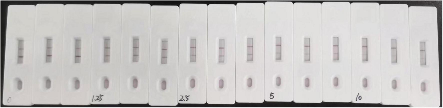 The positive samples prepared in section “Sample preparation” were measured. Six parallel tests were conducted with three batches of test strips at each level, and the addition recovery and intra-assay coefficient of variation were calculated using the actual measured value of each added mass fraction to judge the test strip accuracy and precision.