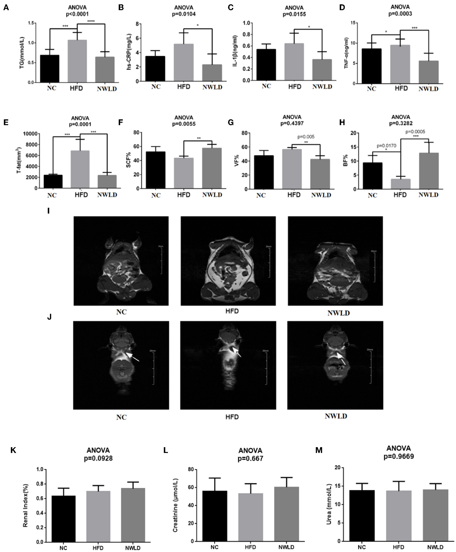 Comparison of phenotypic factors among groups. Bar charts of (A) serum triglycerides (TG), (B) hs-CRP, (C) IL-1β, (D) TNF-α, (E) total fat, (F) subcutaneous fat percentages, (G) visceral fat percentages, (H) brown fat percentages, and (I) white fat (the highlighted areas in the abdomen and subcutaneous tissue) in each group (coronal plane). Images were taken from NC4 section 7, HFD3 section 9, and NWLD3 section 6. (J) Brown fat of mice in different groups (butterfly areas are indicated by arrows). Images were taken from NC2 section 8, HFD5 section 29, and NWLD4 section 29. *p < 0.05; **p < 0.01; ***p < 0.001; ****p < 0.0001. Bar charts of (K) renal index, (L) serum creatinine, (M) serum urea.