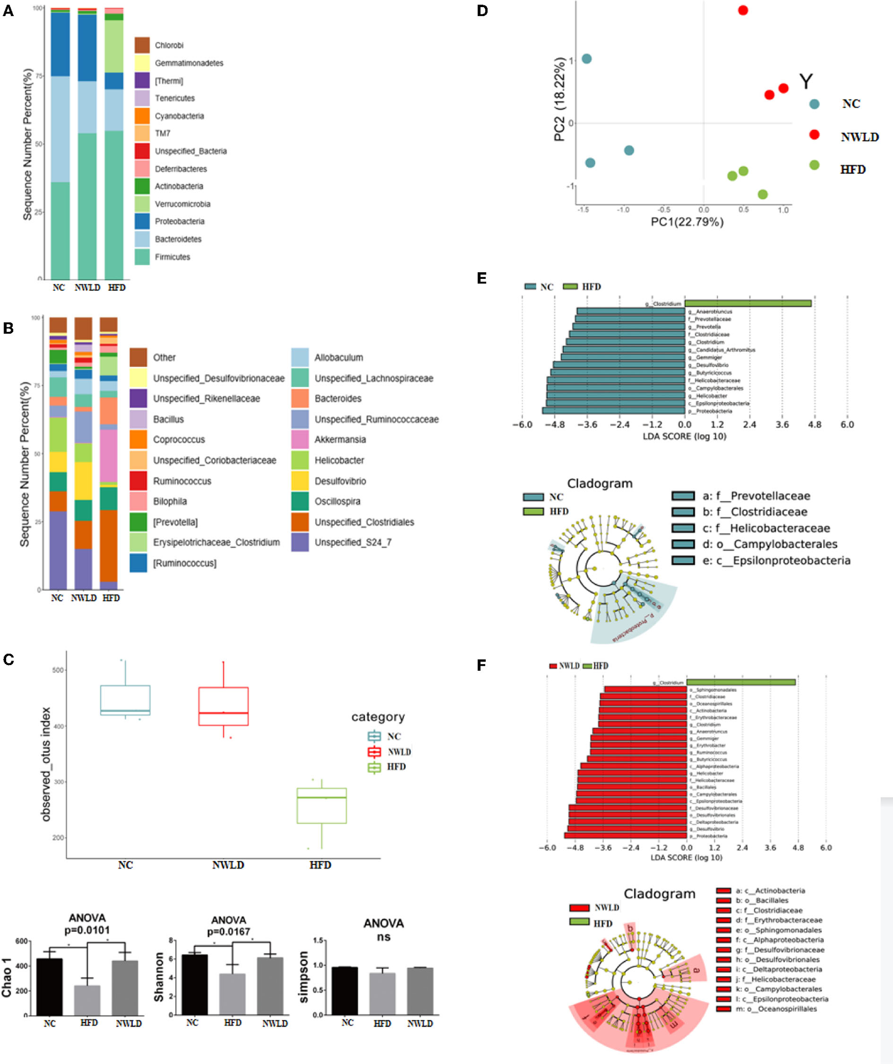 Compared to the NC and NWLD groups, the characteristic genus of the HFD group was Clostridium, which was from the Firmicutes phylum, Erysipelotrichaceae family (Figure 2D).