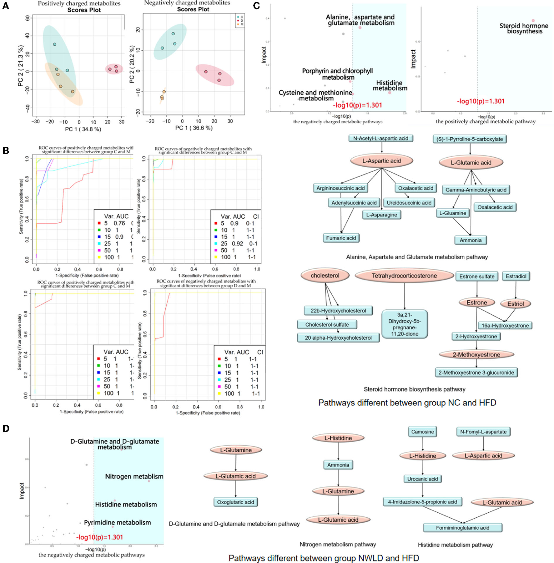 Fecal untargeted metabolomics results. (A) Principal component analysis score plots for discriminating the fecal metabolome (positive and negative charge metabolites) from the NC, HFD, and NWLD groups; (B) SVM ROC curves. The abscissa indicates accuracy, and the ordinate indicates sensitivity. AUC values closer to 1 indicate a better predictive accuracy and a greater difference in metabolites between groups; (C) ORA and topology analyses of metabolic pathways with significant differences between groups NC and HFD. The horizontal coordinate represents the ORA p-value, and the blue area is significant (p < 0.05). The vertical axis shows the impact value in the topology analysis. Maps of the main metabolic pathways are shown, including the alanine, aspartate, and glutamate metabolism pathways and steroid hormone biosynthesis; (D) ORA and topological analyses of the metabolic pathways with significant differences between groups NWLD and HFD and maps of the main metabolic pathways, including D-glutamine, D-glutamate, nitrogen, and histidine metabolism pathways.