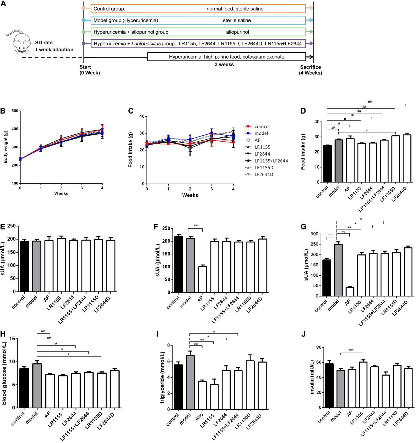 Effects of LR1155 and LF2644 on body weight, food intake and metabolic parameters in hyperuricemia rats. (A) The timeline of the rat experiment. (B) Body weight and (C) food intake during the experiment. (D) Food intake on week 4. (E–G) Serum UA levels on weeks 0, 1, and 4. (H) Blood glucose, (I) triglyceride and (J) insulin levels at the end of the experiment. PO, potassium oxonate; AP, allopurinol; LR1155D and LF2644D, heat-killed LR1155 and LF2644. Data are expressed as mean ± SEM (n = 10–12 per group). *P < 0.05, **P < 0.01 vs. the model group, #P < 0.05, ##P < 0.01 vs. the control group.