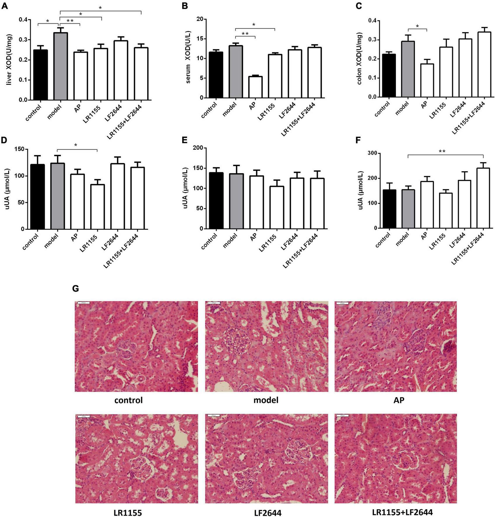 Effects of LR1155 and LF2644 on XOD activities, urine UA levels and renal histology in hyperuricemia rats. (A–C) Activities of XOD in liver, serum and colon. (D–F) Urine UA levels on weeks 0, 1, and 4. (G) Kidney tissues by H&E stain observed at a magnification of 200 ×. Data are expressed as mean ± SEM (n = 10–12 per group). *P < 0.05, **P < 0.01 vs. the model group.