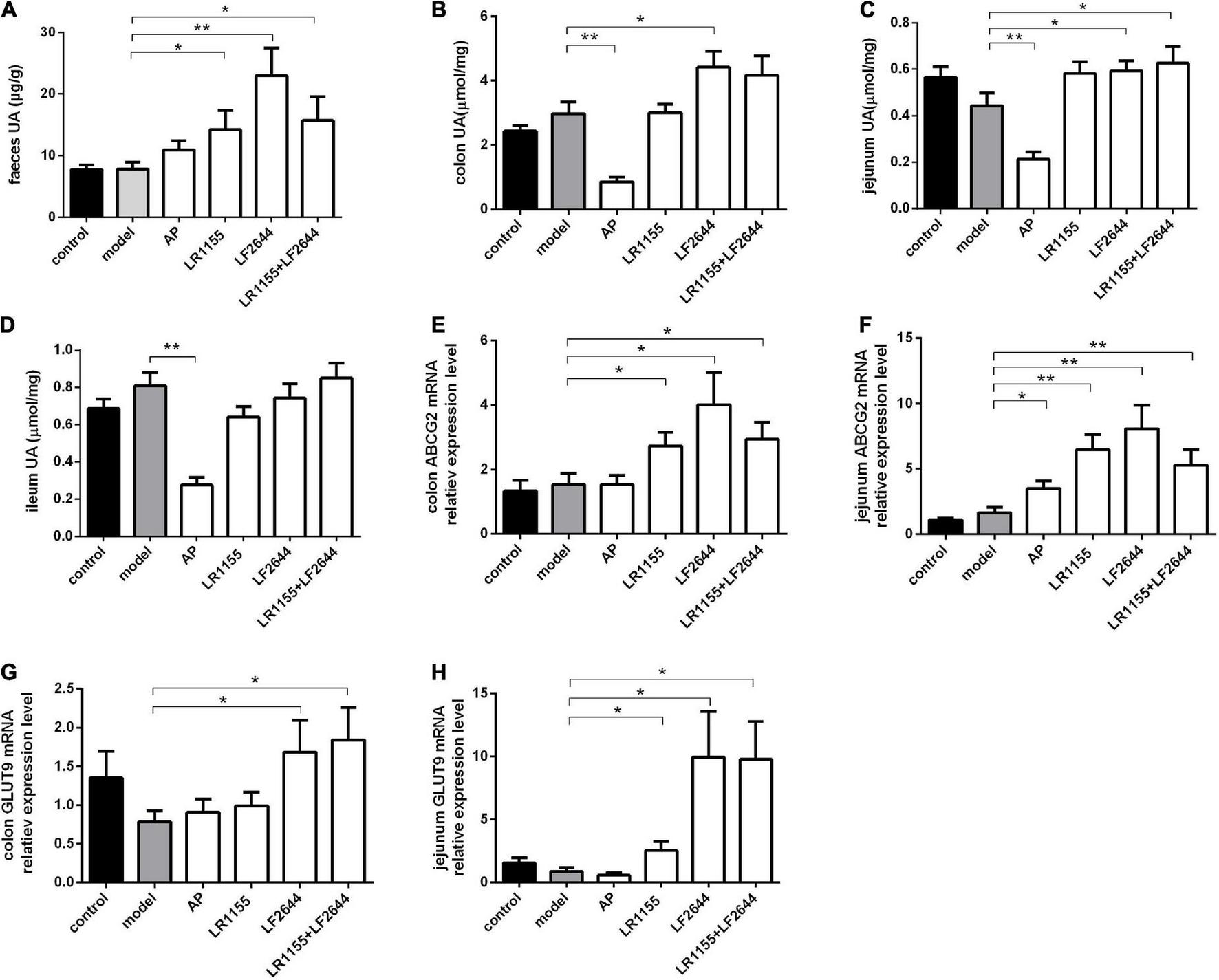 Effects of LR1155 and LF2644 on intestinal uric acid excretion in hyperuricemia rats. (A) Fecal UA levels. (B–D) UA contents of colon, jejunum and ileum. (E,F) Gene expressions of ABCG2 in colon and jejunum. (G,H) Gene expressions of GLUT9 in colon and jejunum. Data are expressed as mean ± SEM (n = 10–12 per group). *P < 0.05, **P < 0.01 vs. the model group.