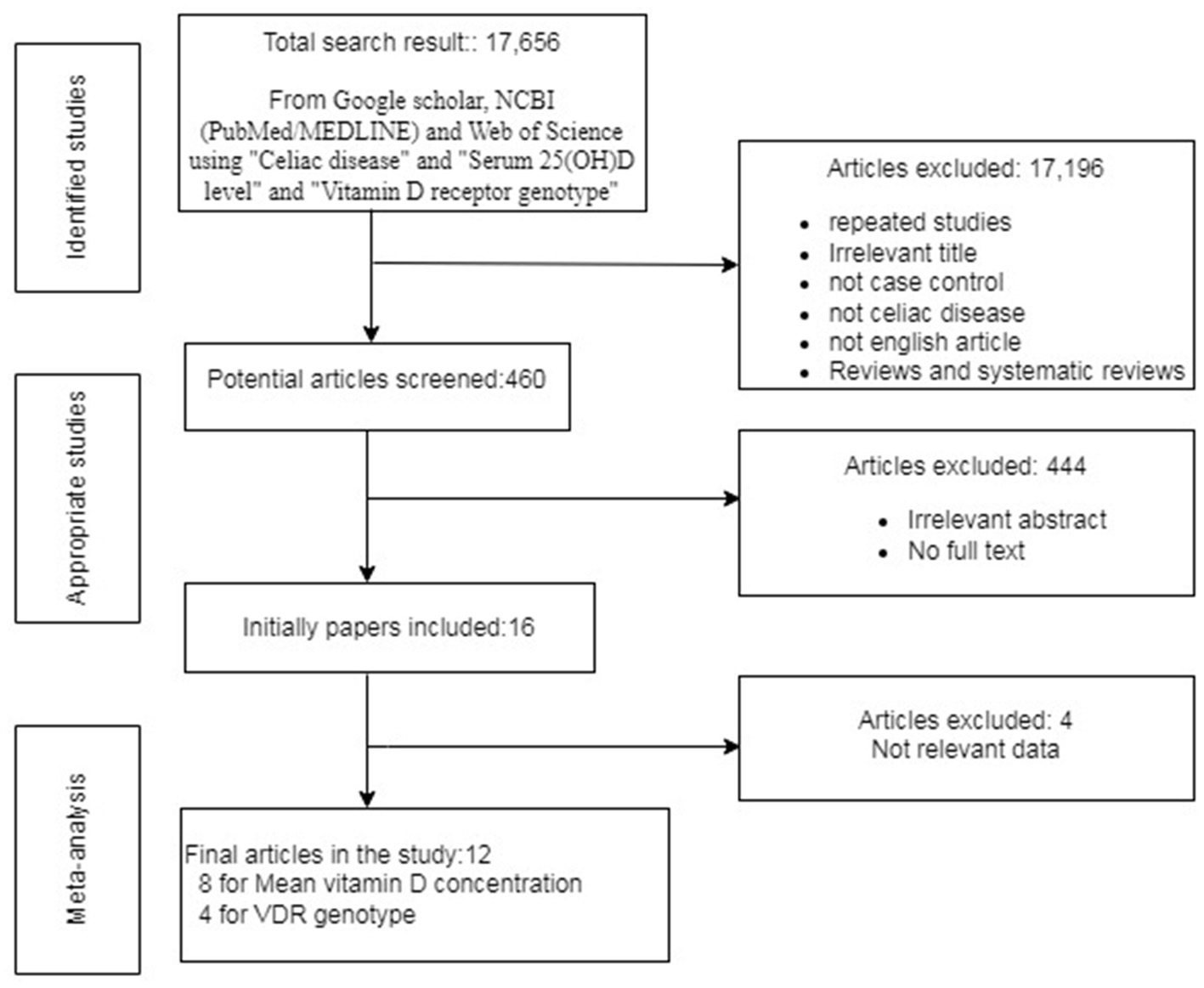 After employing all the above-described literature retrieval strategies, we got a total of 17,656 studies. Overall, 17,196 studies were excluded based on the inclusion and exclusion criteria because of irrelevant titles or because they were review articles or were not in the English language. After screening the rest of the articles, 444 articles were excluded from our study because of duplicate publications, irrelevant abstracts (in silico, in vitro, in vivo studies, case studies), and articles without full text. Initially, a total of 16 studies were considered for this study but due to the lack of relevant data, four articles were excluded. Finally, 12 studies that satisfied our inclusion and exclusion criteria and had the data of serum 25(OH)D level and VDR genotype in CD cases and control were included in this meta-analysis as shown in Figure 1. All these data of mean serum 25(OH)D concentration and the genotype of VDR SNPs Bsm1 rs1544410, Apa1 rs7975232, Fok1 rs2228570, Taq1 rs731236, and their summary statistics are provided in Tables 1, 2.