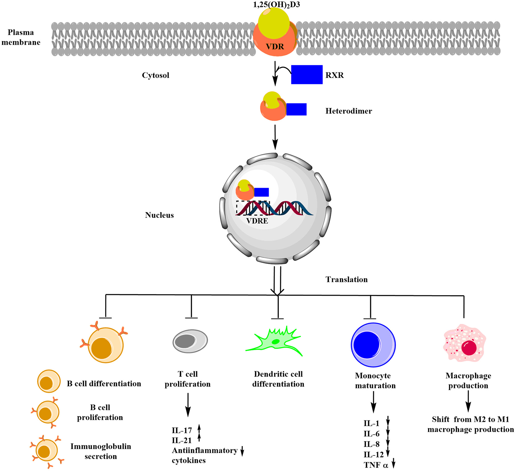 Schematic representation of the role of vitamin D in immune regulation in CD. Upon binding of vitamin D3 with VDR, RXR is recruited and results in the formation of a heterodimer known as VDR-RXR complex, whose translated product (formed by binding of the heterodimer with VDRE) exerts immune modulation by inhibiting differentiation and proliferation of B-cell, T-cell, and dendritic cells and also inhibits immunoglobulin secretion.