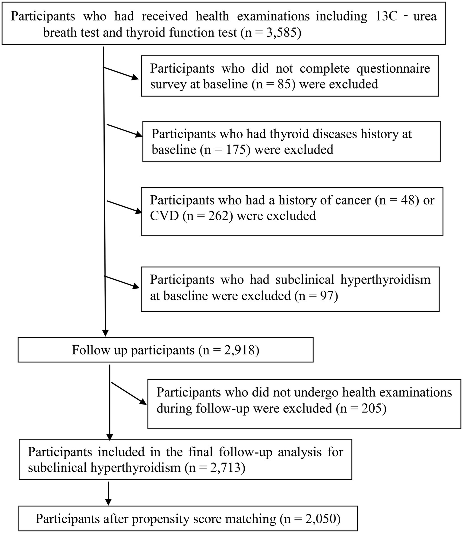 This prospective cohort study investigated 2,713 participants. H. pylori infection was diagnosed with the carbon 13 breath test. Subclinical hyperthyroidism was defined as serum thyroid-stimulating hormone levels are low or undetectable but free thyroxine and tri-iodothyronine concentrations are normal. Propensity score matching (PSM) analyses and Cox proportional hazards regression models were used to estimate the association between H. pylori infection and subclinical hyperthyroidism.