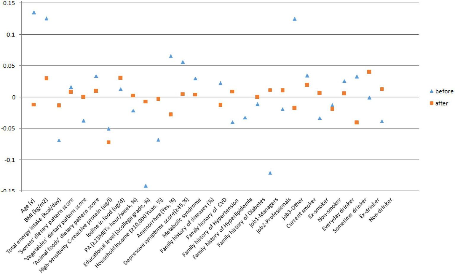 | “Vegetables” dietary pattern score | 0.16 (0.12, 0.21) | 0.13 (0.08, 0.17) | 0.26 | 0.16 (0.12, 0.21) | 0.16 (0.12, 0.21) | 1.00 |