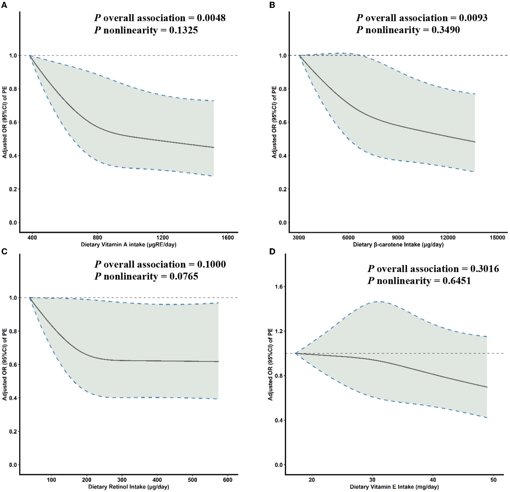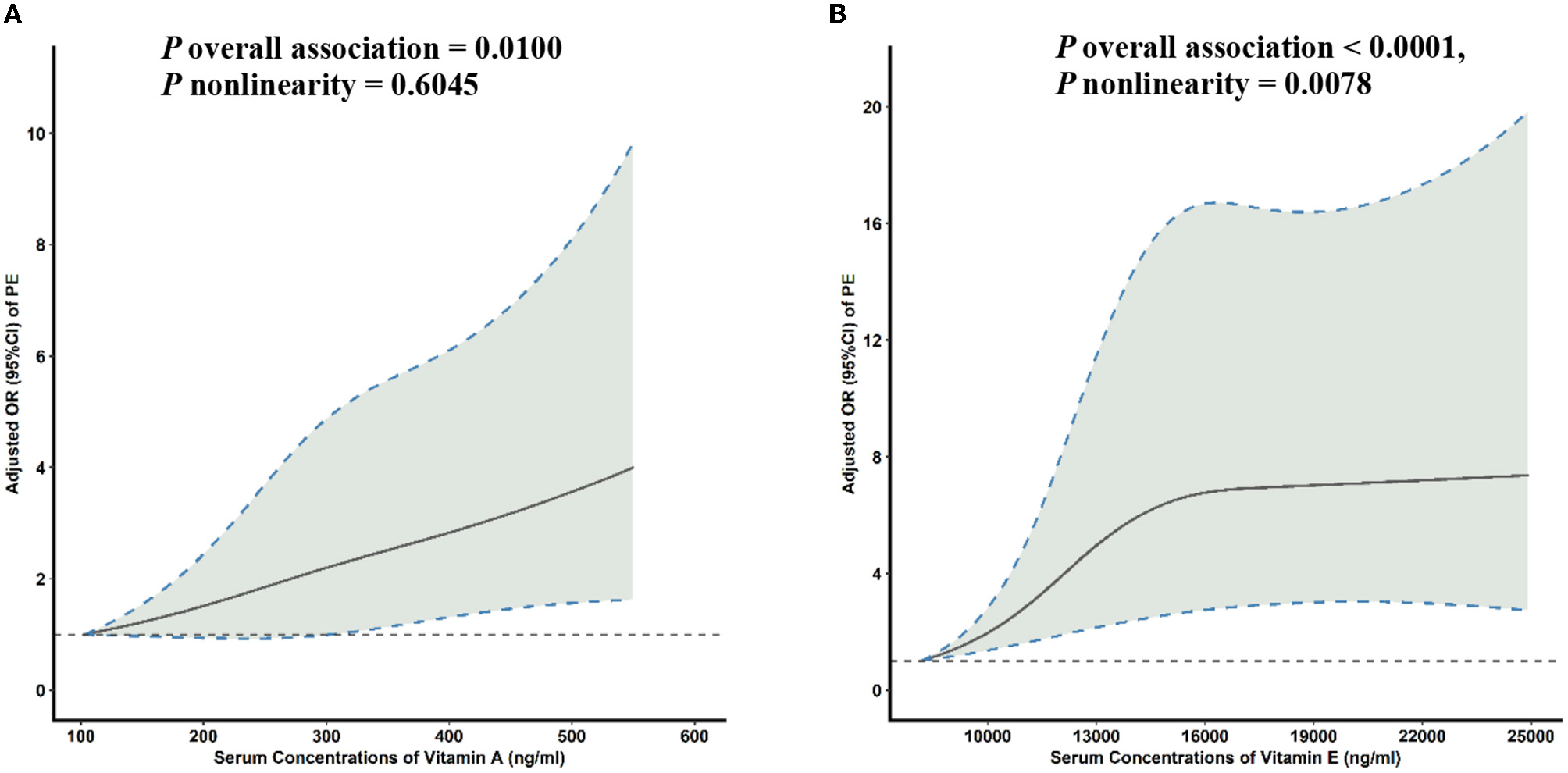 Potential confounders were adjusted for in the multivariate models, including age, gestational age, pre-pregnancy BMI, family history of hypertension (yes or no), education level (primary school or less, secondary/high school, college/university, or above), parity (0 births, 1 birth, ≥2 births), physical activity, and daily energy intake. A sensitivity analysis of the relationship between dietary VA and VE intake and PE risk was performed by excluding participants with GDM. Potential non-linear associations of dietary and serum VA and VE concentrations with PE risk were examined using restricted cubic spline (RCS) analysis. The 20th, 50th, and 80th percentiles were retained as knots. The RCS was calculated using R 4.0.3. All other analyses were performed using SPSS 25.0 (SPSS Inc., Chicago, IL, United States). A two-tailed P-value of < 0.05 was considered statistically significant. The missing values in our study were ignored as they were < 10%.