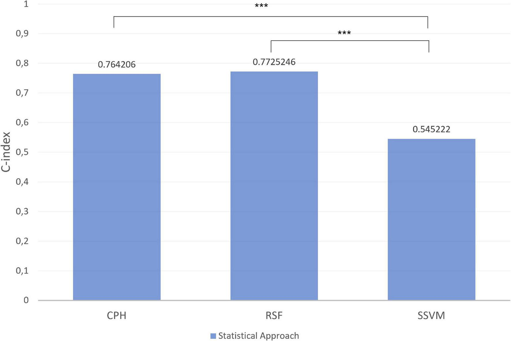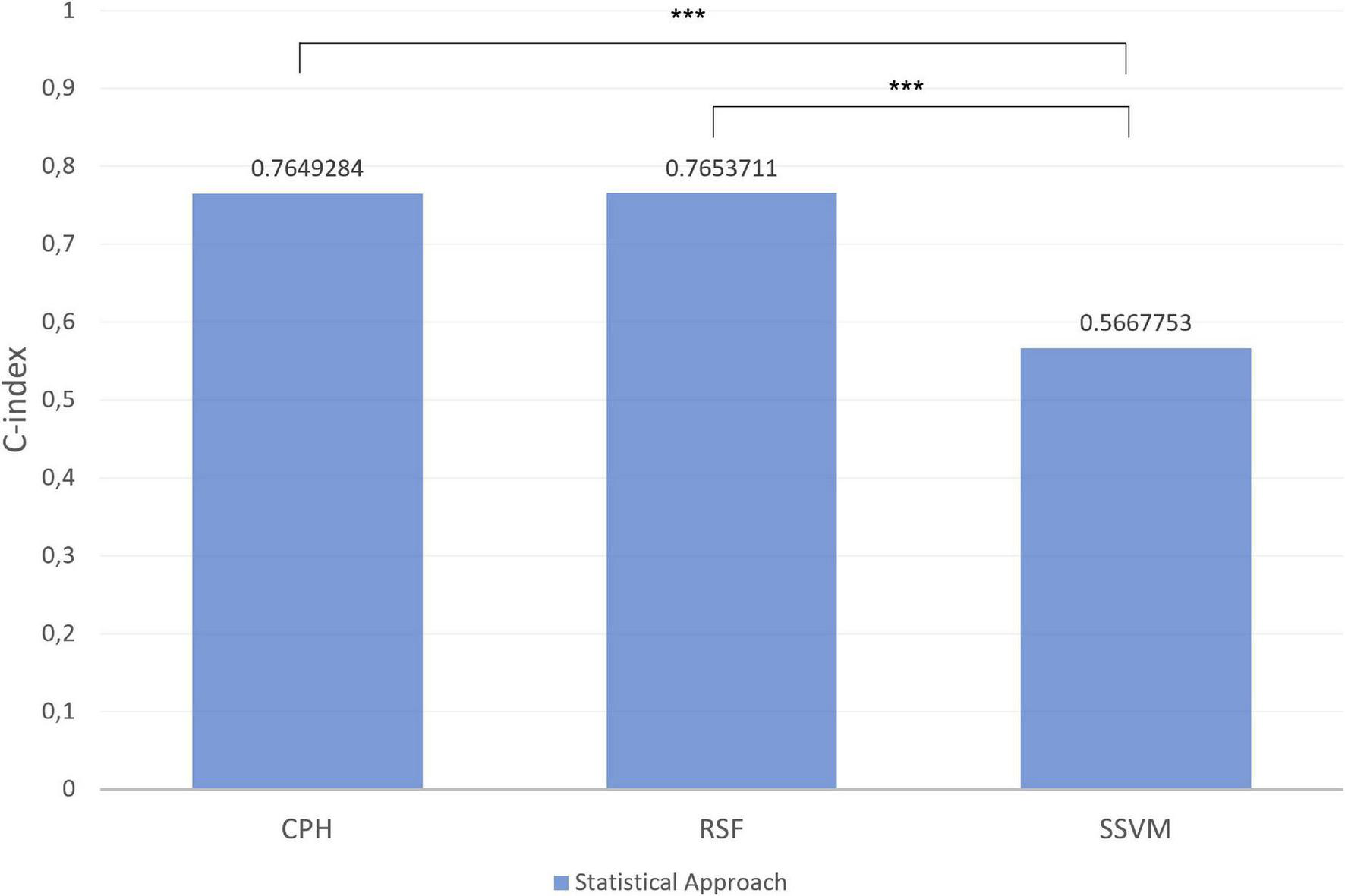 After running these models the C-Index was used to evaluate the performance of the model on the test subset. Finally, to compare differences between C-Index values from the models values, paired Student’s t-test was used.