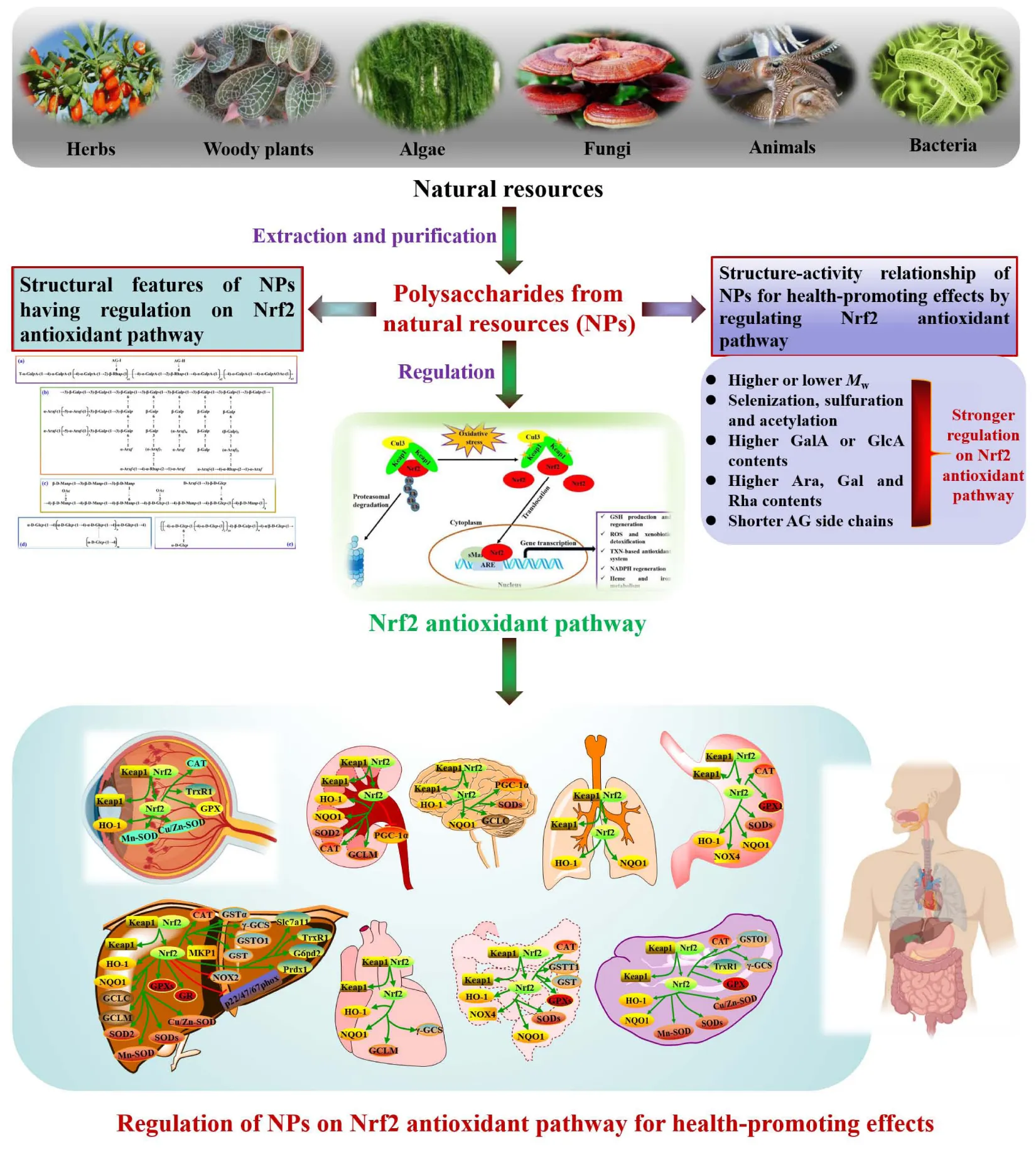 In this review, structural features of NPs, having regulation on Nrf2 antioxidant pathway, from herbs, woody plants, algae, fungi, animals and bacteria, are overviewed. Moreover, regulatory effects of these NPs on the pathway for health-promoting effects in vitro and in vivo are systematically summarized. Furthermore, influences of structural characteristics like molecular weight (Mw), functional group, monosaccharide composition and side chains on the regulatory effects of NPs on Nrf2 antioxidant pathway are preliminarily discussed. Otherwise, the prospects on future work for regulation of NPs on Nrf2 antioxidant pathway are proposed.