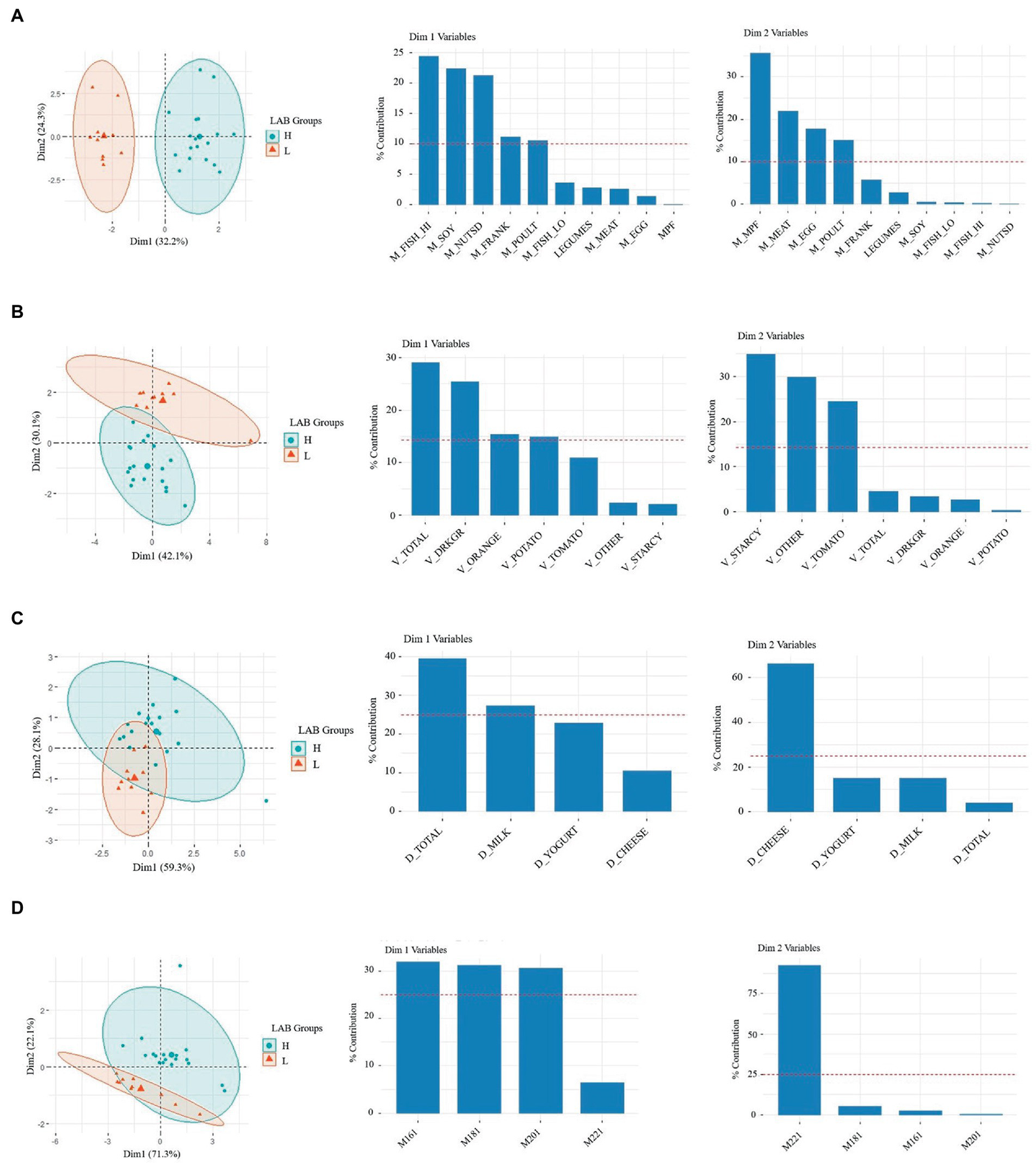 Principal component analysis (PCA) of H-LAB and L-LAB groups by habitual intake of (A) meats (oz), (B) vegetables (oz), (C) dairy (oz), and (D) monounsaturated fats (mg). The variables for each of the two dimensions and their % contribution to the variance are given in the eigenvector charts for each PCA plot.