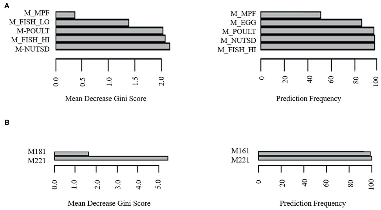 To determine potential biomarkers of LAB in the gut of healthy adults, the machine learning techniques extreme gradient boosting and random forest were employed. Extreme gradient boosting was used to build several highly accurate models for the prediction of H-LAB and L-LAB categorization. The most accurate models include those trained with all food groups, proteins, fatty acids (sfats, mfats, and pfats), and vegetables (Table 4). Each separate model had a 100% accuracy and singular variables with 100% importance in the model. The important features of each model were tomato, fish high in M3 fatty acids (M_fish_hi), S080, M221, P184, and tomato, respectively. To validate the results of the extreme gradient boosting decision tree modeling, random forest models were trained with the dietary intake variables and refined over 500 iterations using an 80/20 cross-validation scheme (Table 5). Models with >85% prediction accuracy were considered significant, and variables with both high importance and high frequency of prediction were chosen as potential biomarkers of LAB. First, all nutrition variables were analyzed together to create a predictive model. This model, along with all others, was repeated over 500 iterations to determine its reproducibility. The model with all 97 variables was not accurate in its predictions with highly variable accuracy of 93.8 ± 26% (Table 4). Next, dietary intake variables were then separated into categories (given in Supplementary Table S1). Of these, only two accurate models were found: proteins and monounsaturated fatty acids. The model of protein intake was both accurate and predictive of LAB grouping (accuracy = 98.6 ± 11.8%), with predictor variables being fish high in n-3 fatty acids (“M_FISH_HI”) and nuts and seeds (“M_NUTSD”; Figure 2A). All other food groups were not predictive of LAB group (Table 4). Interestingly, the monounsaturated fatty acid model trained with all monounsaturated fatty acids has a high error rate (accuracy = 87.2 ± 33.4%; Figure 2B). However, the model trained with only erucic acid (“M221,” C22:1) yielded an accuracy of 100%, meaning intake of M221 alone can be used to accurately predict LAB grouping (Figure 2B, Table 4). From these models nuts and seeds, fish high in N-3 fatty acids, and erucic acid (C22:1) were identified as potential biomarkers of LAB.