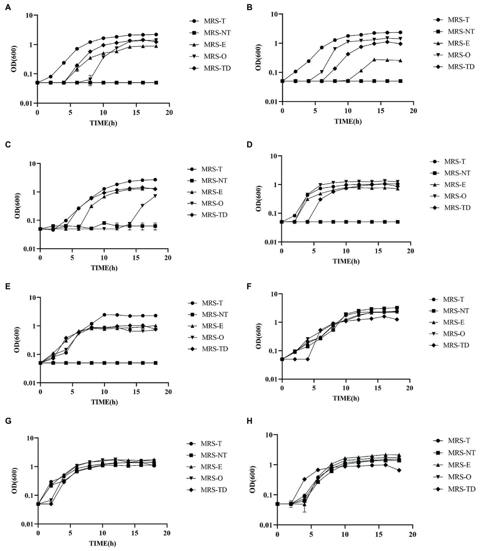The bacterial strains used are found in Supplementary Table S4. All strains were first activated in MRS-T (10 g/L peptone, 10 g/L beef extract (Bacto), 5 g/L yeast extract (Bacto), 20 g/L glucose, 2 g/L di-potassium hydrogen phosphate, 5 g/L sodium acetate, 2 g/L ammonium citrate tribasic, 0.2 g/L magnesium sulfate, 0.05 g/L manganese sulfate, 1 ml/L Tween 80). To evaluate the growth requirement of fatty acids, growth experiments were performed in four variations of MRS-T. First, MRS-NT was formulated by removing Tween 80 from MRS-T. Then, oleic or erucic acid was added at 0.1% (v/v) to make MRS-O or MRS-E, respectively. MRS-T with 0.1% DMSO was used as a vehicle control (MRS-TD). For growth curves, cells were subcultured twice in MRS-T for 16 h at 37°C. From the second activation culture, cells were pelleted by centrifugation at 3,000× rpm for 8 min and washed with MRS-NT. Cells were then suspended in MRS-NT and used to inoculate the media with the different fatty acids at an initial optical density (OD600) of 0.05 in biological triplicates. Cells were incubated at 37°C and OD600 recorded at 2 h intervals for a total of 18 h. Growth kinetics μmax and duplication time (DT) were estimated using a linear model of exponential phase. Statistics were performed in R as described previously by ANOVA and t-test, with p < 0.05 being considered statistically significant.