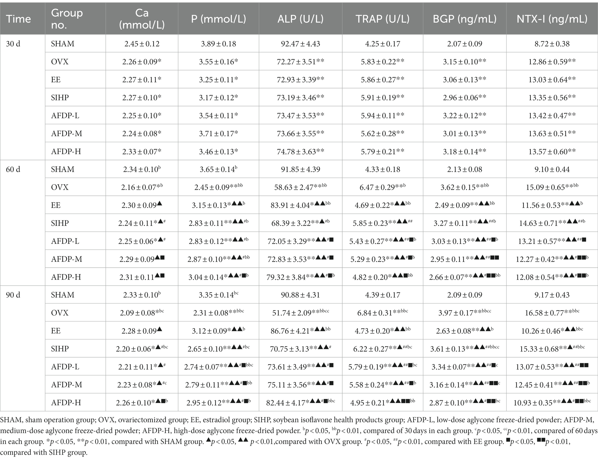 As shown in Table 3, the serum calcium (Ca) and phosphorus (P) levels in each group on 30th day had significantly decreased than the SHAM group (p < 0.05), but there was no significant difference between the remaining groups. The serum Ca and P levels in the OVX group decreased and were significantly lower than those of the SHAM group (p < 0.05) on 60 and 90th days. Studies have shown that the estrogen level influenced serum Ca and P, and the binding ability of Ca and the level of serum P are weakened in the absence of estrogen, resulting in enhanced osteoclast bone resorption, accelerated bone loss, and decreased bone mass (29, 30). Compared with the OVX group, after 60 days of intervention with EE, SIHP and AFDP, the serum Ca and P levels increased significantly (p < 0.05), and the intervention effect of AFDP was superior to the SIHP group. These results showed isoflavone aglycone provides the same function as estrogen, which could alleviate the decrease of serum Ca and P levels in ovariectomized rats.