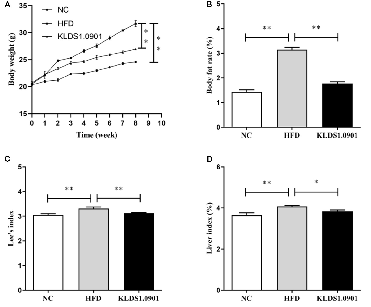 Effect of L. acidophilus KLDS1.0901 administration on body weight (A), body fat rate (B), Lee's index (C), and liver index (D) of HFD-fed mice. NC, normal control group; HFD, high-fat diet group; and KLDS1.0901, L. acidophilus KLDS1.0901 group. *p < 0.05 and **p < 0.01 indicated that there was a significant difference when compared with the HFD group.