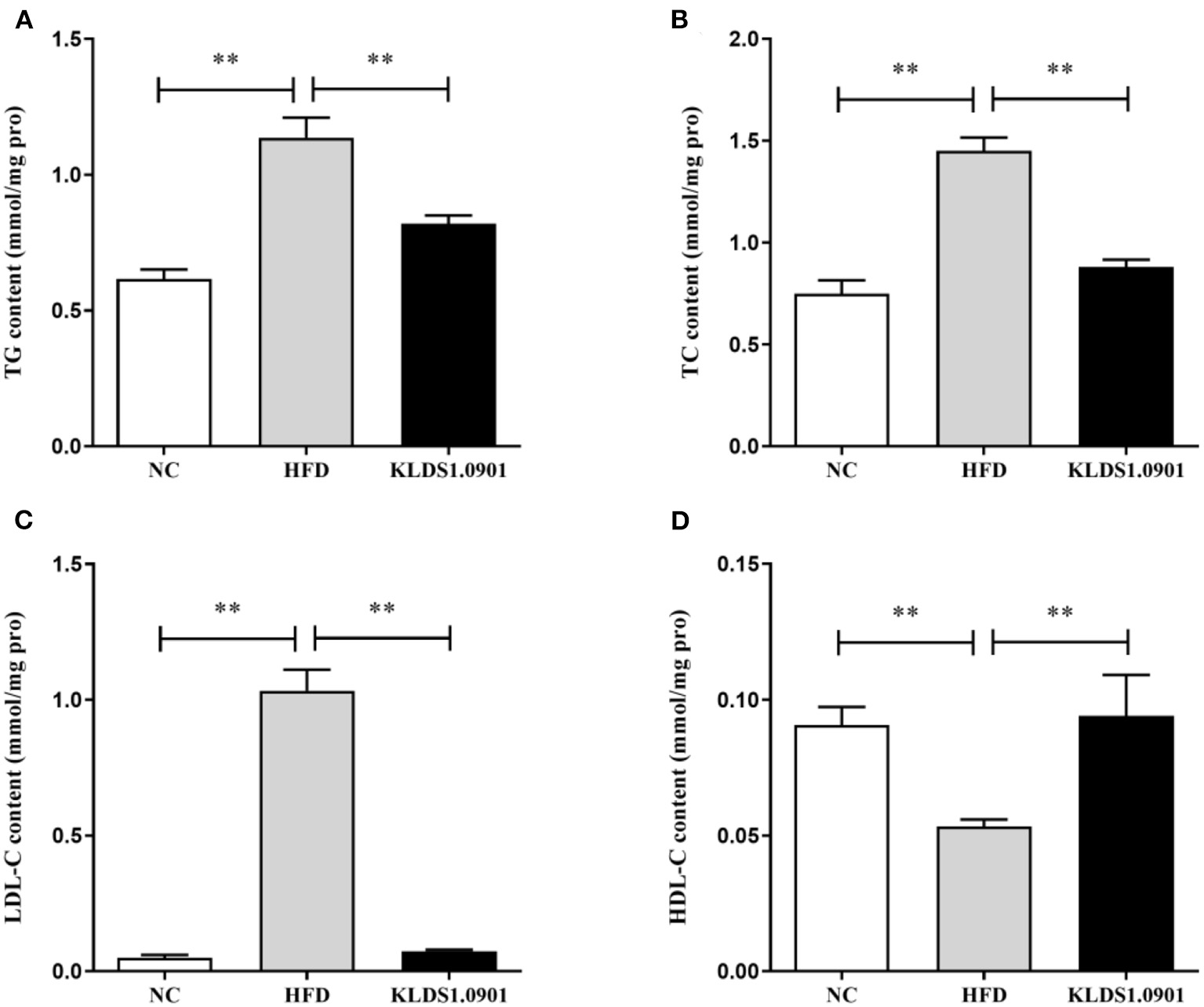 Effects of L. acidophilus KLDS1.0901 administration on lipid accumulation in HFD-fed mice. NC, normal control group; HFD, high-fat diet group; and KLDS1.0901, L. acidophilus KLDS1.0901 group. (A) Hepatic triglyceride (TG) level; (B) hepatic total cholesterol (TC) level; (C) hepatic low-density lipoprotein cholesterol (HDL-C) level; and (D) hepatic high-density lipoprotein cholesterol (LDL-C) level. Values are expressed as mean ± SD (n = 8). **p < 0.01 indicated that there was a significant difference when compared with the HFD group.