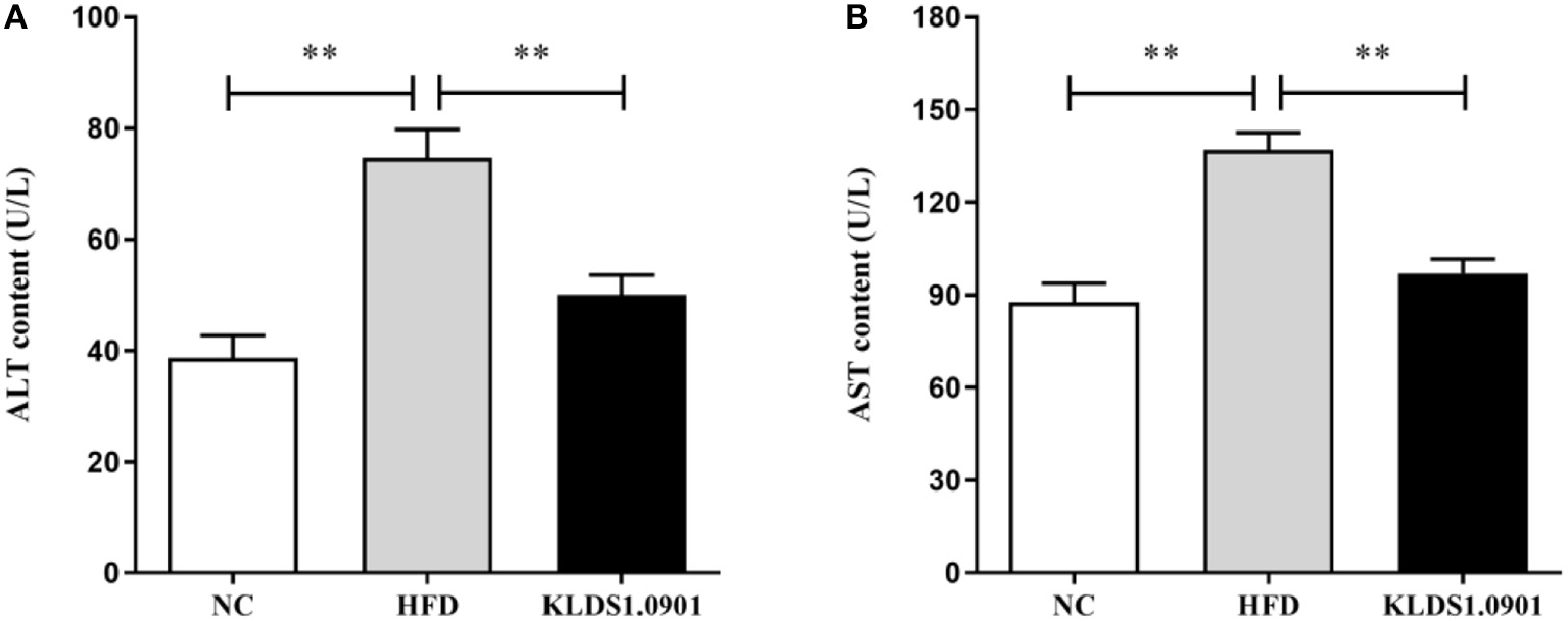 Effects of L. acidophilus KLDS1.0901 administration on liver function. NC, normal control group; HFD, high-fat diet group; and KLDS1.0901, L. acidophilus KLDS1.0901 group. (A) Serum alanine aminotransferase (ALT) level; and (B) serum aspartate aminotransferase (AST) level. Values are expressed as mean ± SD(n = 8). **p < 0.01 indicated that there was a significant difference when compared with the HFD group.