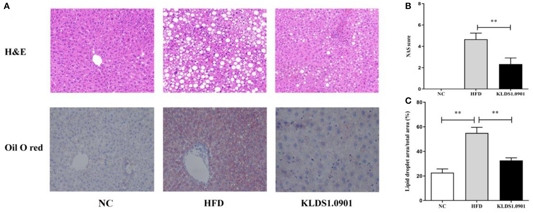Effects of L. acidophilus KLDS1.0901 administration on histological alterations of the liver. NC, normal control group; HFD, high-fat diet group; and KLDS1.0901, L. acidophilus KLDS1.0901 group. (A) The representative histological changes of liver sections; (B) NAFLD Activity Score (NAS); and (C) quantification of Oil Red O-stained hepatic lipid droplets. Values are expressed as mean ± SD (n = 8). **p < 0.01 indicated that there was a significant difference when compared with the HFD group.