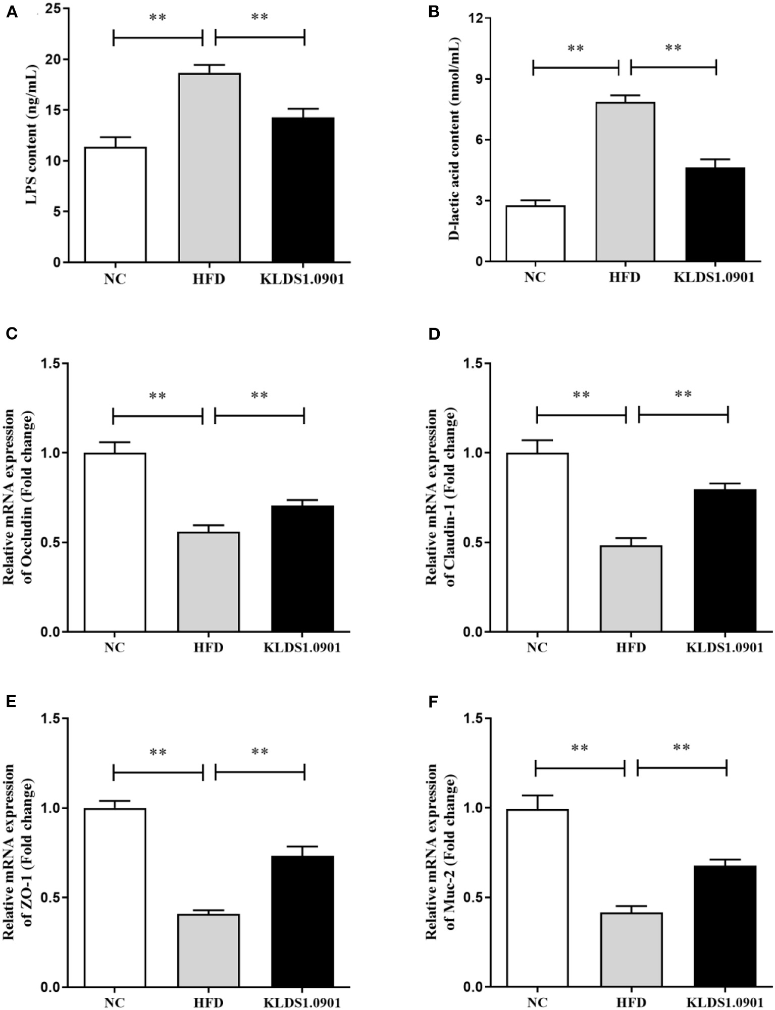 Effects of L. acidophilus KLDS1.0901 administration on the intestinal permeability and gut barrier. NC, normal control group; HFD, high-fat diet group; and KLDS1.0901, L. acidophilus KLDS1.0901 group. (A) Serum LPS concentration; (B) serum D-lactic acid concentration; (C) occludin; (D) claudin-1; (E) ZO-1; and (F) Muc-2. Values are expressed as mean ± SD (n = 8). **p < 0.01 indicated that there was a significant difference when compared with the HFD group.
