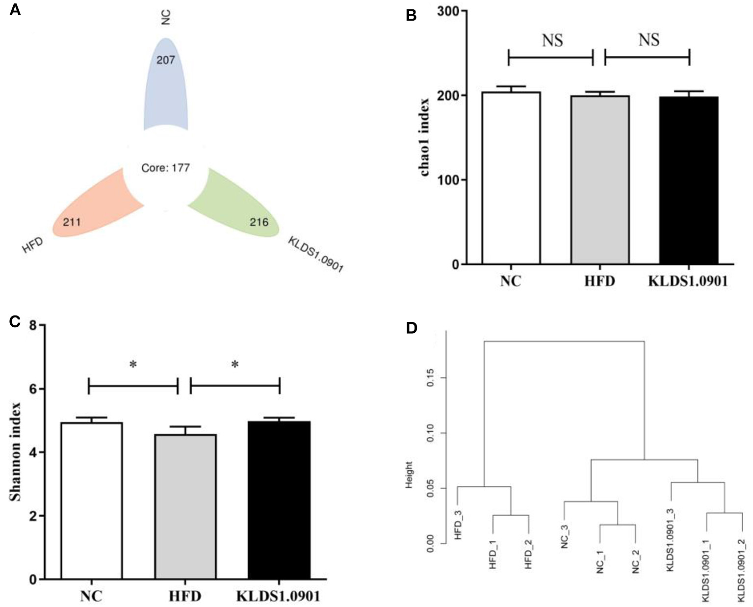 L. acidophilus KLDS1.0901 administration regulates (A) the number of OTUs, (B) Chao 1 index, (C) Shannon index, and (D) the hierarchical clustering tree of weighted UniFrac distances. NC, normal control group; HFD, high-fat diet group; and KLDS1.0901, L. acidophilus KLDS1.0901 group. Values are expressed as mean ± SD (n = 8). *p < 0.05 indicated that there was a significant difference when compared with the HFD group. NS indicated that there was no significant difference when compared with the HFD group.