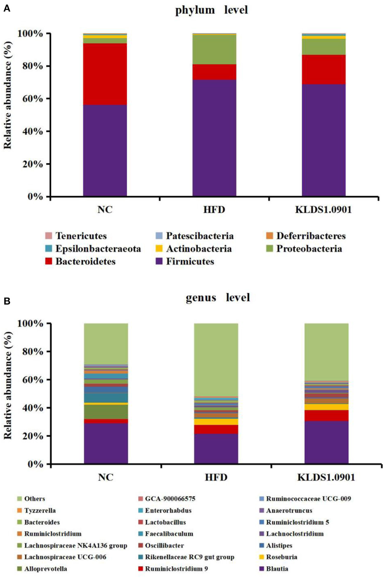 Changes of the gut microbiota at the phylum (A) and genus (B) level after L. acidophilus KLDS1.0901 administration. NC, normal control group; HFD, high-fat diet group; and KLDS1.0901, L. acidophilus KLDS1.0901 group.