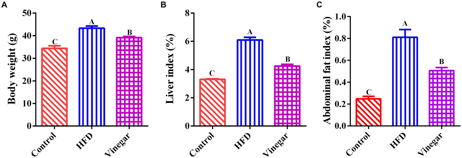 Effects of Jujube vinegar on body weight, liver index, and abdominal fat index in HFD-fed mice. (A) Body weight, (B) liver index. (C) abdominal fat index. Data are expressed as the means ± SEM, n = 10. Lowercase letters indicate significant differences (p < 0.05), uppercase letters indicate highly significant differences (p < 0.01), the same below.