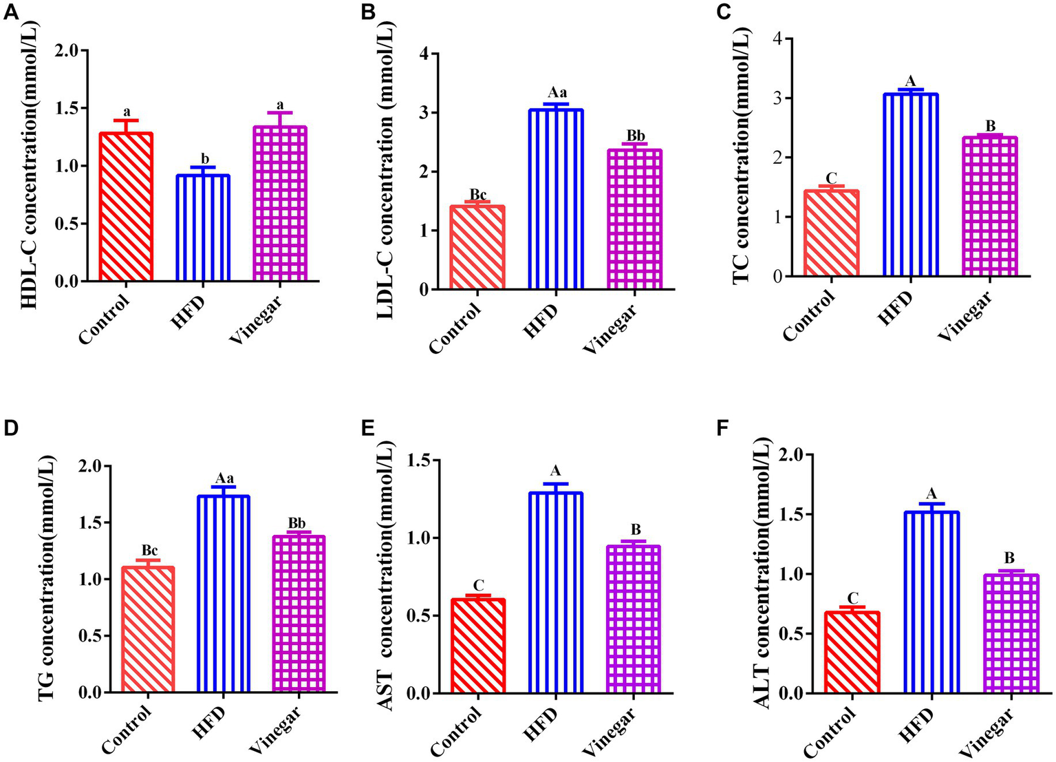 Figure 2, illustrated that, in contrast to the CON treatment, the serum HDL-C concentration in the HFD treatment dropped heavily (p < 0.05, Figure 2A), while the serum LDL-C, TC, ALT, and AST drastically grew (p < 0.01, Figures 2B,C,E,F). The serum HDL-C in the VIN treatment did not differ significantly (Figure 2A). In contrast, the vinegar group’s serum LDL-C (p < 0.05, Figure 2B) and TC and TG fell dramatically (p < 0.01, Figures 2C,D). These findings implied that a hyperlipemia model could be successfully established in mice fed a diet containing 45% fat. Jujube vinegar improved liver function and reduced blood lipid levels by enhancing serum HDL-C concentration and lowering serum TC, TG, and LDL-C.