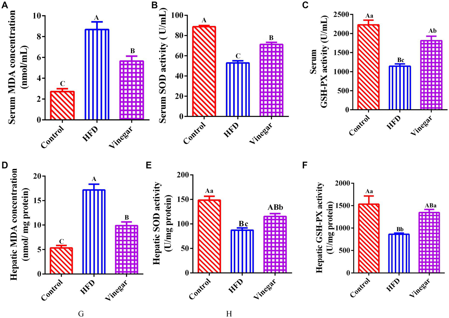 Jujube vinegar was able to upregulate serum SOD and GSH-Px activities and downregulate serum MDA concentration in the HFD-fed mice (p < 0.01, Figures 3A–C). The results of hepatic SOD, GSH-Px, and MDA were broadly consistent with those of serum measurements (p < 0.01, Figures 3D–F). The findings showed that jujube vinegar could boost antioxidant levels in HFD mice.