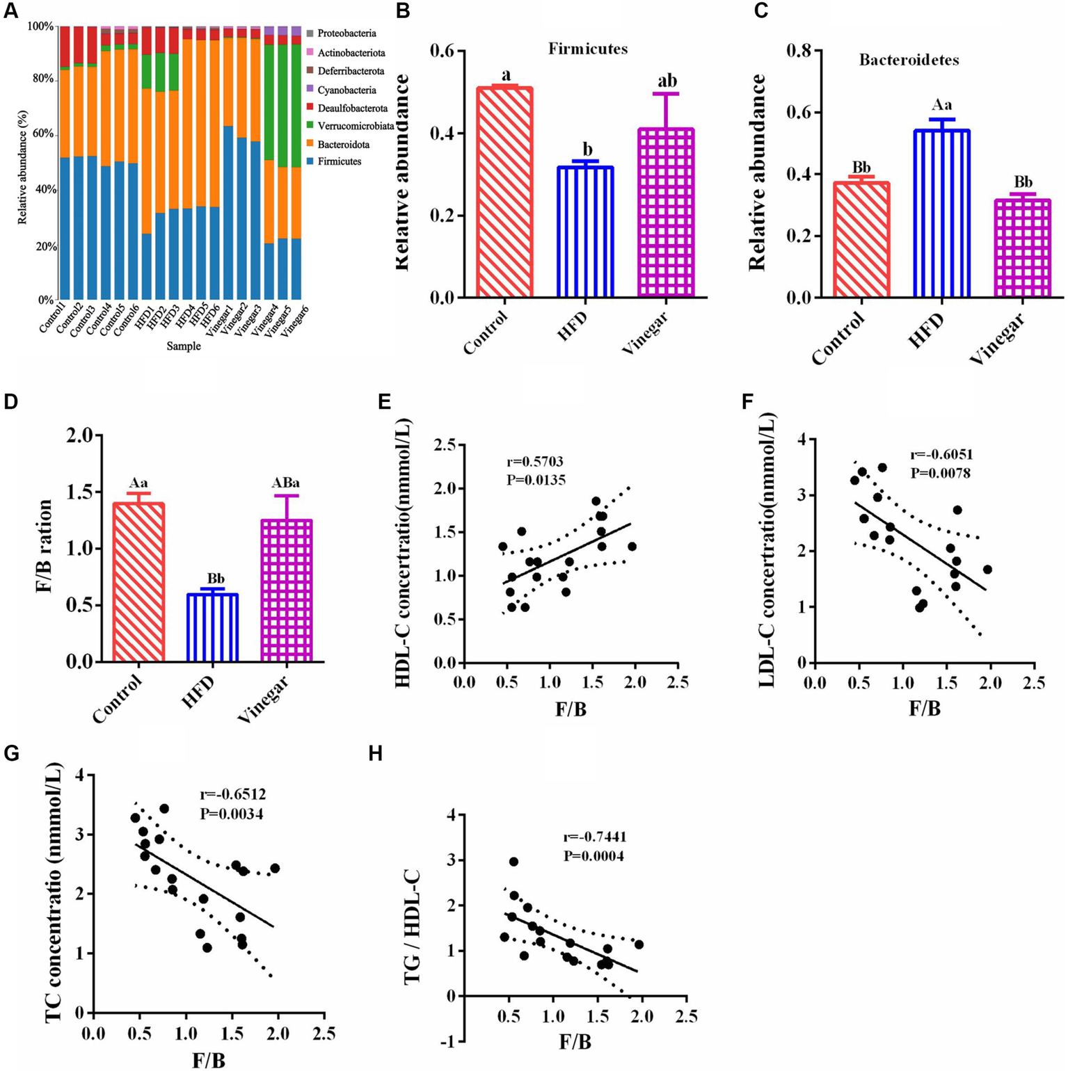 The HFD group’s bar graph of Firmicutes to Bacteroidota (F/B) was considerably lower than that of the vinegar and control treatments (p < 0.01, Figure 5D). The F/B ratio was positively correlated with HDL-C, with correlation coefficient r = 0.5266, p = 0.0248 (Figure 5E); the F/B ratio is negatively correlated with LDL-C (correlation coefficient r = − 6,051, p = 0.0078, Figure 5F), TC (correlation coefficient r = −6,512, p = 0.0006, Figure 5G), and the TC/HDL-C ratio (r = − 0.7441, p = 0.0004, Figure 5H). These results showed that Bacteroidota and Firmicutes were the dominant bacteria in the gut. The HFD mice reduced the ratio of F/B, which caused the disorder of the prevalent bacteria in the mice’s gut. The F/B ratio was negatively correlated with TC, LDL-C, and TG/HDL-C, indicating that the lipid-lowering effect of jujube vinegar was related to the disorder of Firmicutes and Bacteroidota induced by HFD.