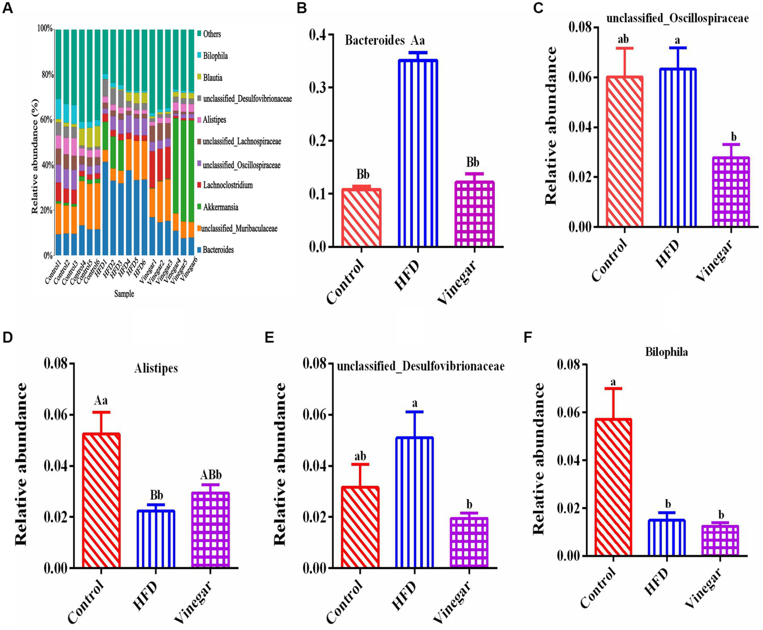 The distribution of the ten most abundant species (abundance ratio > 0.1%) was shown in Figure 6A, including Bacteroides, Unclassified Muribaculaceae, Akkermansia, Lachnoclostridium, Unclassified_Oscillospiraceae, Unclassified_Lachnospiraceae, Alistipes, Unclassified_Desulfovibrionaceae, Blautia, and Bilophila. Compared to the CON treatment, the relative abundance of the genus Bacteroides was significantly higher in the HFD treatment (Figure 6B, p < 0.01), as were the relative abundances of the unclassified_Oscillospiraceae and the unclassified_Desulfovibrionaceae (Figures 6C,E). Alistipes and Bilophila notably fell (Figures 6D, F, p<0.01, and p<0.05, respectively) in the HFD treatment. In contrast, compared to the HFD treatment. Bacteroides (Figure 6B, p < 0.01), Unclassified_Oscillospiraceae (Figure 6C, p < 0.05), and Unclassified_Desulfovibrionaceae (Figure 6E, p < 0.05) significantly decreased, Alistipes increased by 1.26 times (Figure 6D), and Bilophila decreased by 16.54% (Figure 6F) in the vinegar group.