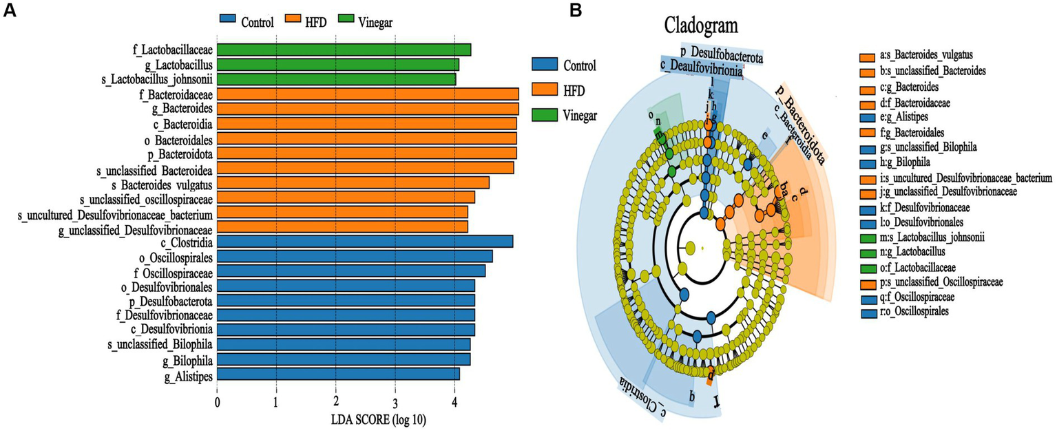 Lefse branch plot. (A) Histogram of distribution of LDA values reveal the microbiome of different taxa among the three groups. Panel (B) shows the different bacterial-rich taxa among the three groups. The concentric rings are species, genus, family, order, class, phylum, and so on. Blue, orange, and green show different bacterial taxa in the control, HFD and Vinegar groups, respectively, and yellow shows no significant differences between groups.
