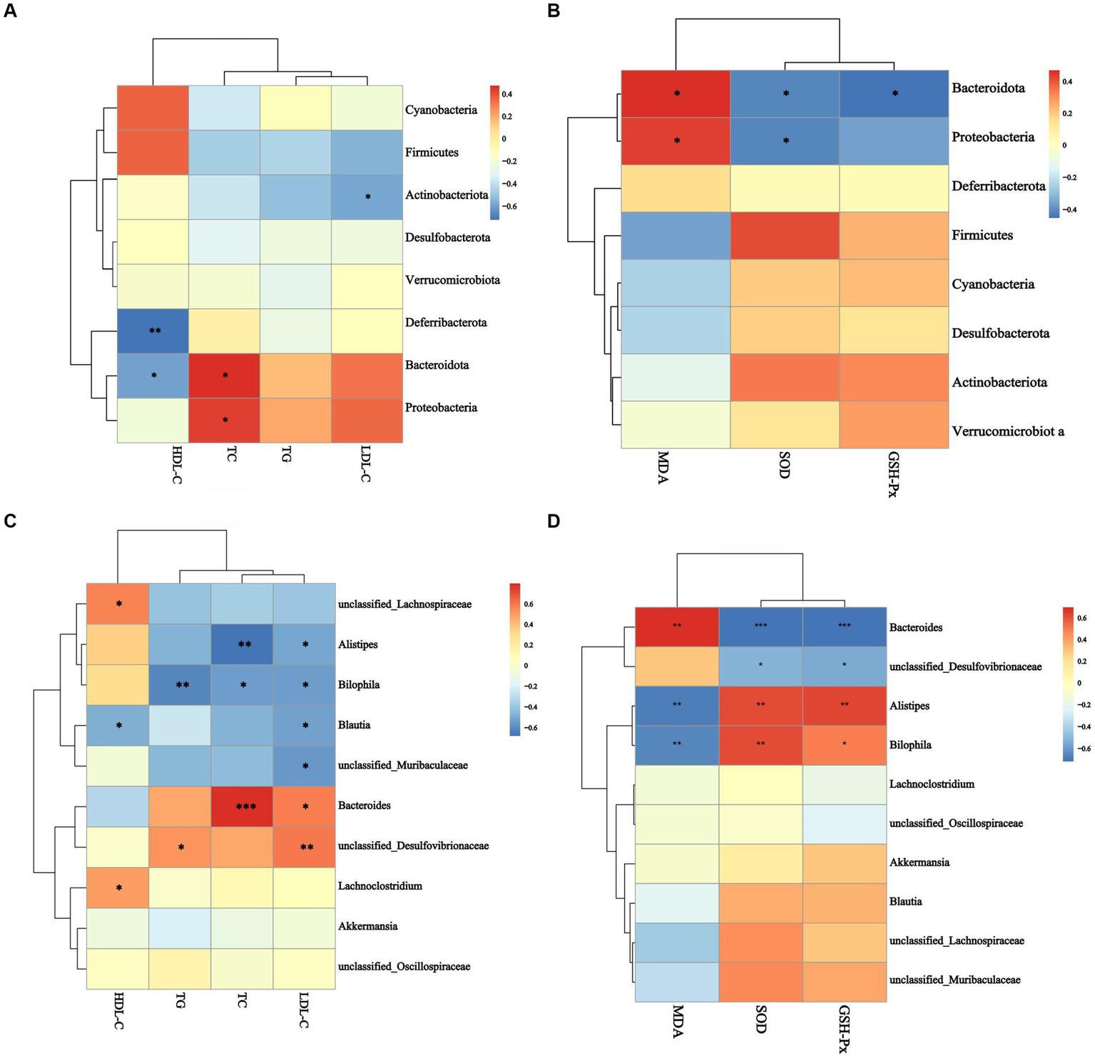 Analysis of the correlation between gut microbiota and blood lipid indexes antioxidant performance. (A) The correlation between gut microbiota and blood lipid index at phylum level, (B) the correlation between gut microbiota and blood lipid index at genus level, (C) the correlation between gut microbiota and antioxidant biomarker at phylum level, (D) the correlation between gut microbiota and antioxidant biomarker at genus level. *p < 0.05, **p < 0.05, ***p < 0.001.