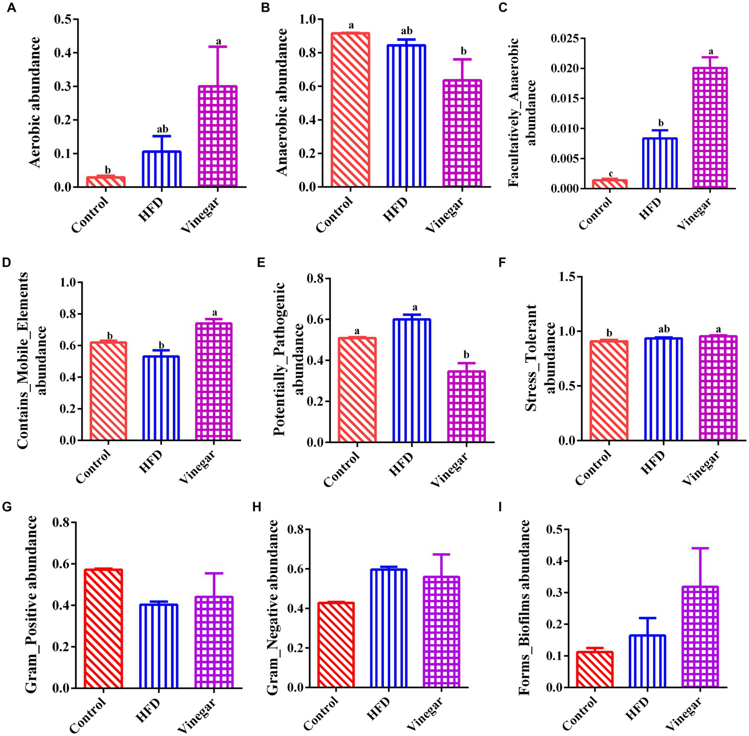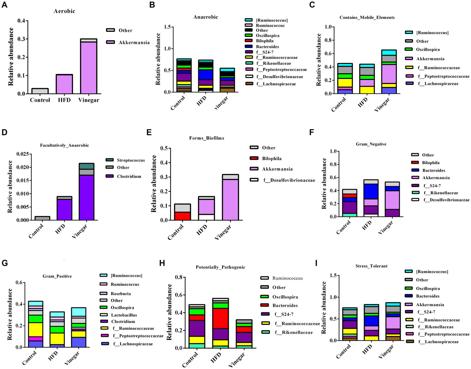 The abundances of the nine phenotypes and the abundances of related genera were shown in Figure 10. The results suggested that HFD increased the abundances of Aerobic, Anaerobic, Facultative_anaerobic, Potential_Pathogens, Stress_Tolerant, and Contains_Mobile_Elements, Gram-Negative, and decreased the abundances of Contains_Mobile_Elements, Gram-Positive, which might be related to the increases of Akkermansia, Enterobacteriaceae, Ruminococcus and Clostridium and the decreases of Bacteroides, Oscillospira, f_Ruminococcaceae, f_Rikenellaceae, f_24–7 (Supplementary Table 5); Aerobic, Anaerobic, Contains_Mobile_Elements, and Facultative_Anaerobic significantly increased than the HFD mice, and Potential_pathogens significantly decreased in the VIN treatment than in the HFD treatment, which may be related to the decreases of Oscillospira, f_Peptostreptococcaceae, Bacteroides, f_Ruminococcaceae, f_Rikenellaceae and the increases of Akkermansia, f_Lachnospiraceae, Clostridium, and Streptococcus (Supplementary Table 5) in the jujube vinegar group.