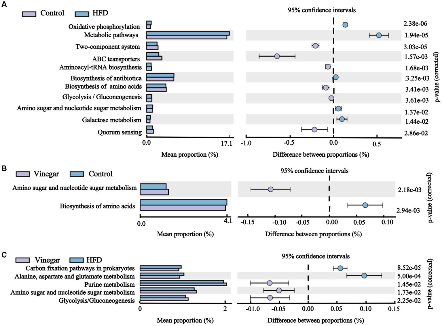 Histogram of KEGG pathway abundance and stamp analysis at level 3. (A) Stamp analysis between the control group and the HFD group, (B) Stamp analysis between the control group and the vinegar group, (C) Stamp analysis between the HFD group and the vinegar group.