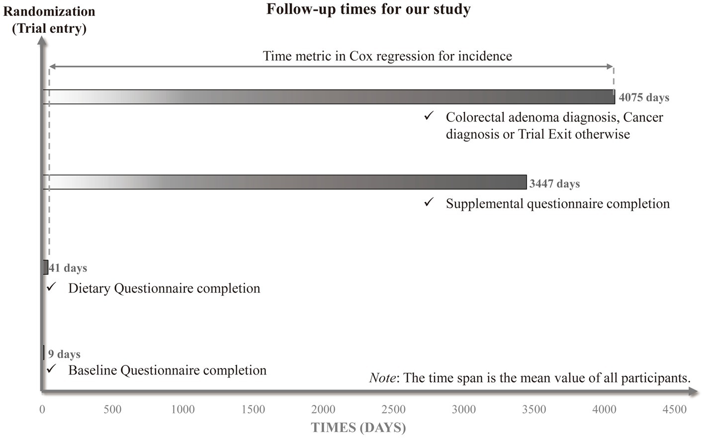 The Cox proportional hazards regression model was constructed with follow-up time as the time variable for estimation of the 95% confidence interval (CIs) and hazard ratios (HRs) of the relationship between SMD score and the risk of colorectal adenoma. It should be emphasized that the main outcome event in this research was the confirmation of adenoma. In this research, the follow-up time was defined as the data from DQX completion to the diagnosis of adenoma, cancer, fatality, loss of follow-up, or end of follow-up (December 31, 2009), whichever came first (Figure 2).