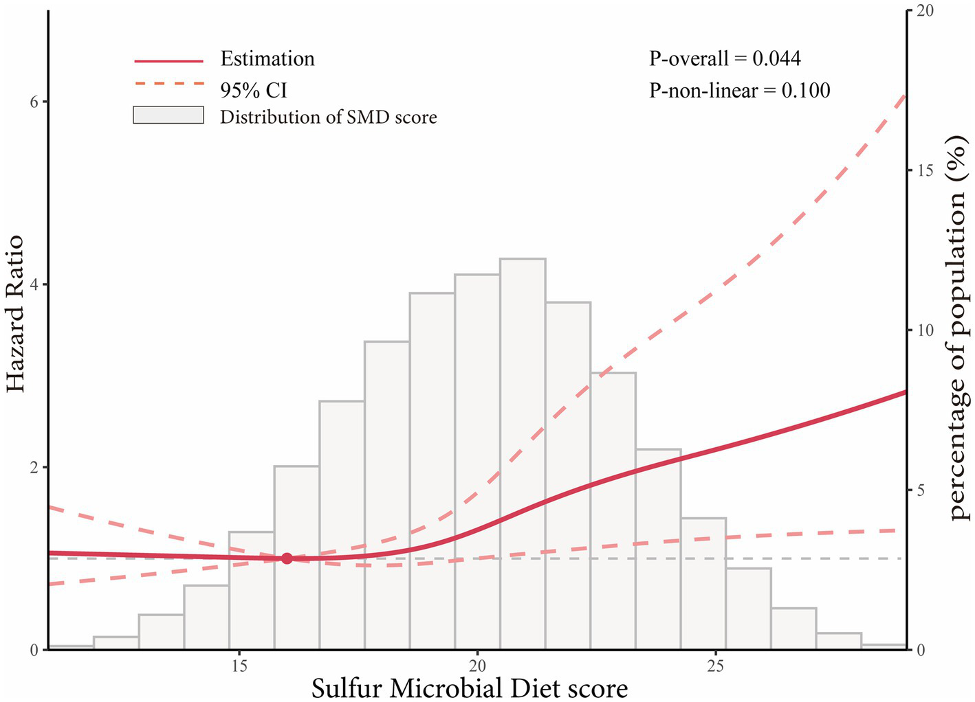 To investigate the existence of a linear trend between quartiles of SMD score and the risk of colorectal adenoma, each participant in the quartile was assigned the median value of the quartile. This was then considered as a continuous variable in cox regression to order to get its p-value, with the reference group considered to be the lowest quartile. As per prior literature review and clinical judgment, sex, race, age, and education levels, total energy intake, BMI, aspirin usage, smoking status, smoking pack-years, as well as the history of hypertension, diverticulitis or diverticulosis, diabetes, colonoscopy, family history of colorectal cancer in past 3 years and physical activity level were adjusted as covariates in multiple regression analyses (11, 22, 26). Meanwhile, 12,916 participants with complete data were selected to test whether the analysis result was influenced by missing data imputation by repeating the same multiple regression analyses. To present colorectal adenoma risk across the full range of SMD score, a restricted cubic spline model with three knots at the 10th, 50th, and 90th was constructed in this study (27).