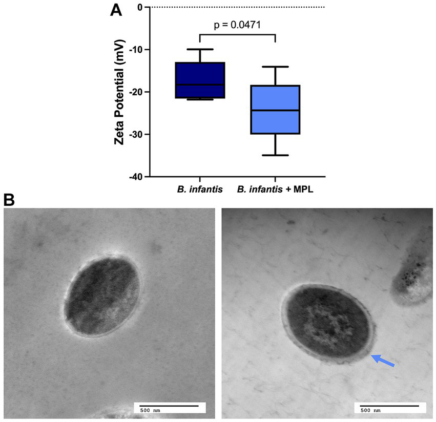 Figure 2. MPL induces surface changes on Bifidobacterium infantis. (A) ζ-potential, or surface charge, of B. infantis with or without 0.5% MPL. (B) Transmission electron micrographs of B. infantis (left) and B. infantis after MPL treatment (right). Blue arrow indicates thicker outer layer after MPL treatment. Statistical analysis was performed using a Student’s t-test (p < 0.05; n = 3).