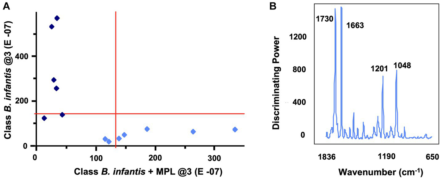 Figure 3. Cooman’s plot (A) depicting sample classification for “Bifidobacterium infantis” vs. “B. infantis + MPL” using soft independent modeling of class analogy (SIMCA) with three principal components. Vertical and horizontal lines show the 95% confidence intervals. Bifidobacterium infantis and B. infantis + MPL samples are represented by dark blue diamonds and light blue diamonds, respectively. Identification of SIMCA discriminating power (B) between MPL-treated and untreated B. infantis using the 2nd derivative of mid-IR spectra. Bacteria were suspended in ethanol and dehydrated using vacuum. Data acquisition was performed using a 4500a series FTIR spectrometer.
